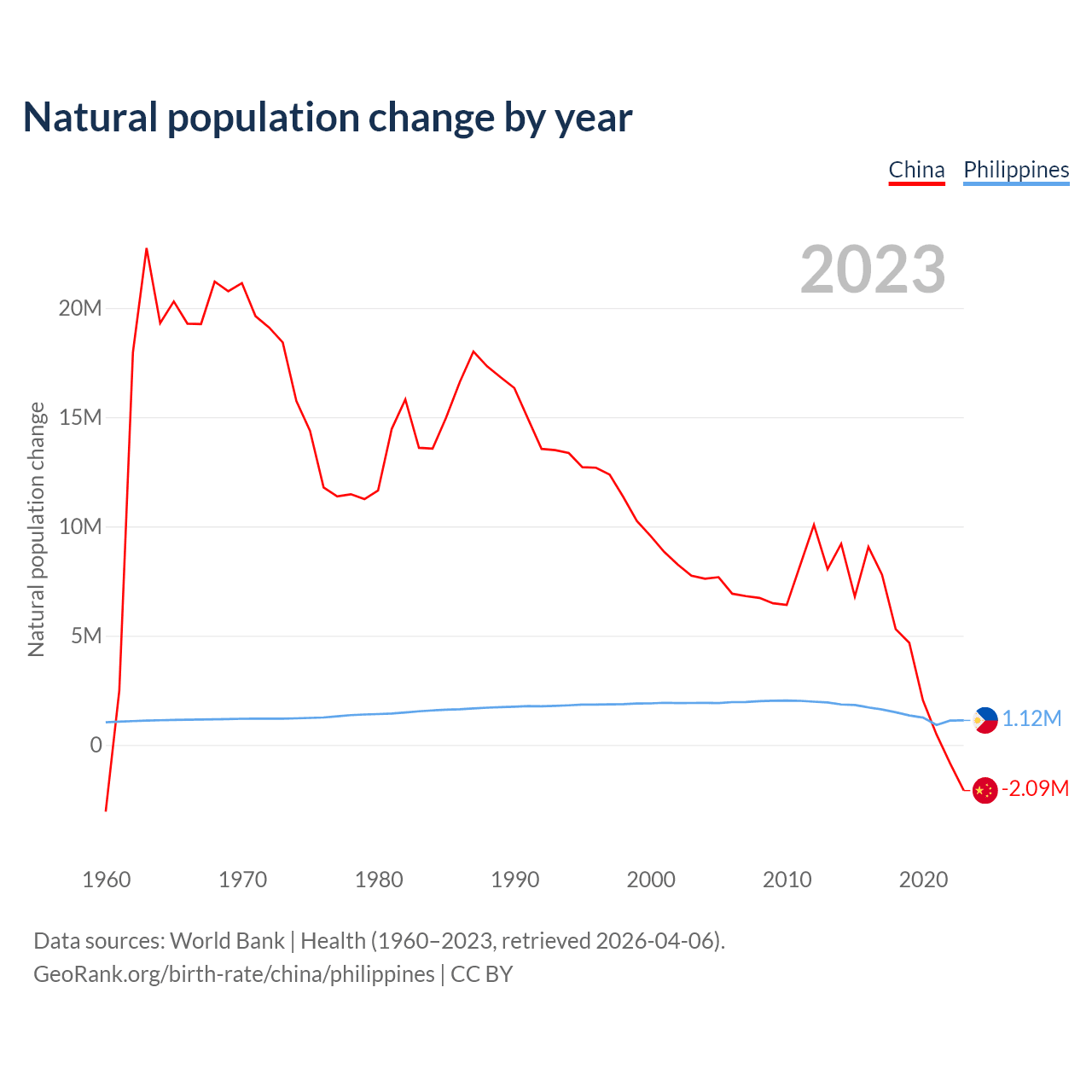 According to the latest available data on birth rates, the fertility rate in China was 1 children per woman in 2023, compared to 1.92 in the Philippines in 2023. The replacement level is considered to be 2.1 children per woman.