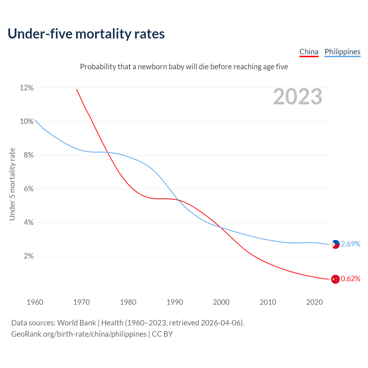 The chance that a newborn baby will die before reaching age five is 0.62% in China and 2.69% in the Philippines. Above is a chart with historical data on under-five mortality rates.