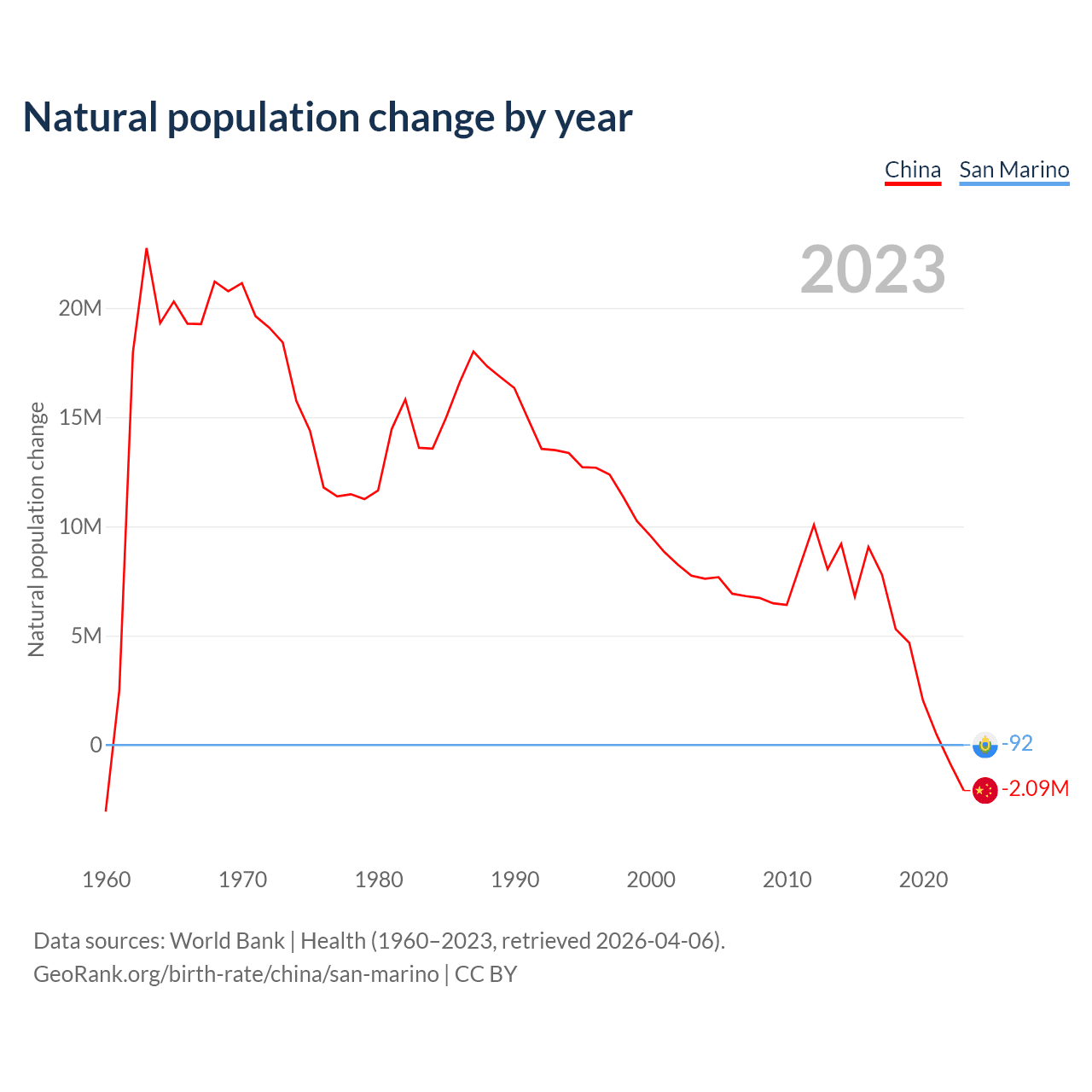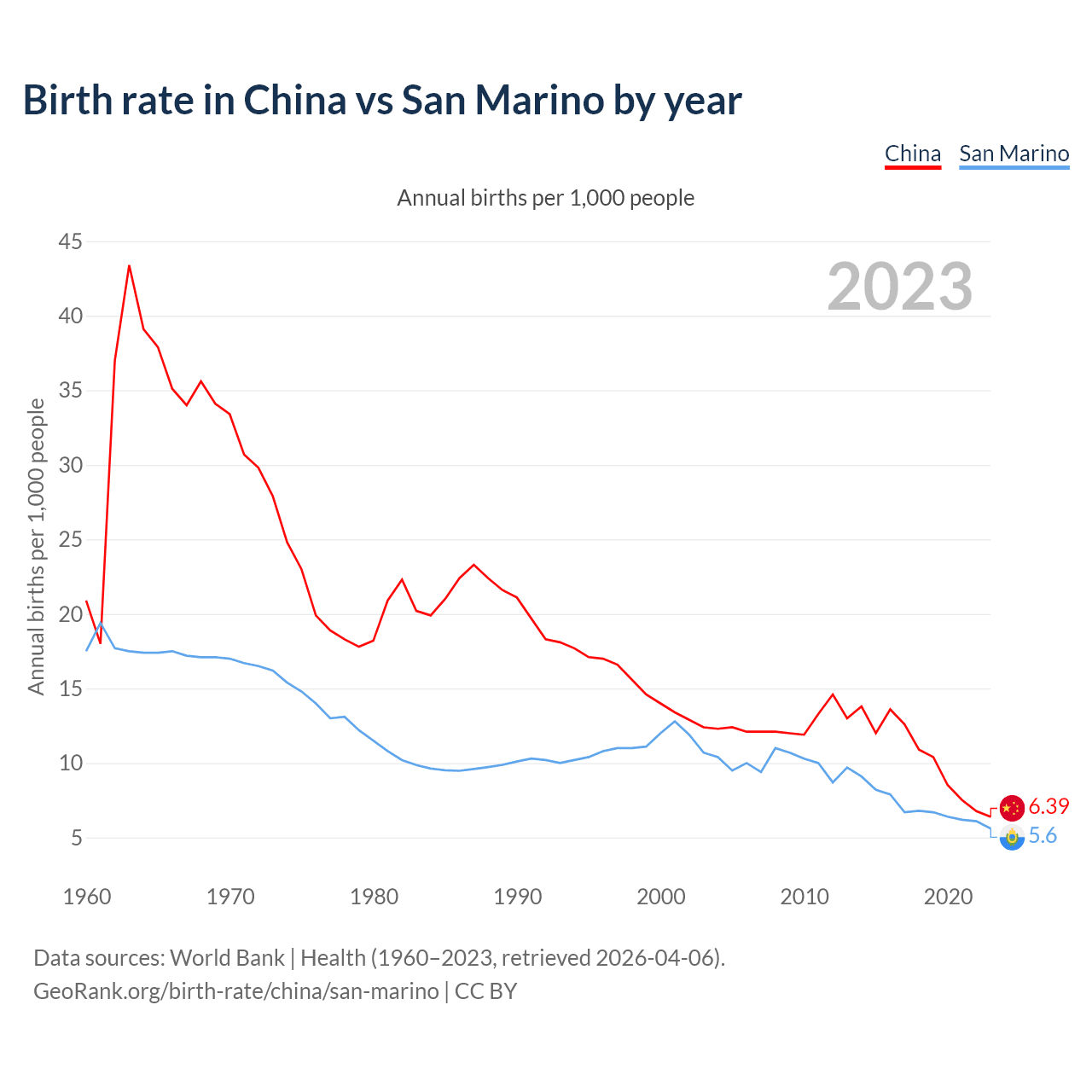 According to the latest available data on birth rates, the fertility rate in China was 1 children per woman in 2023, compared to 1.15 in San Marino in 2023. The replacement level is considered to be 2.1 children per woman.