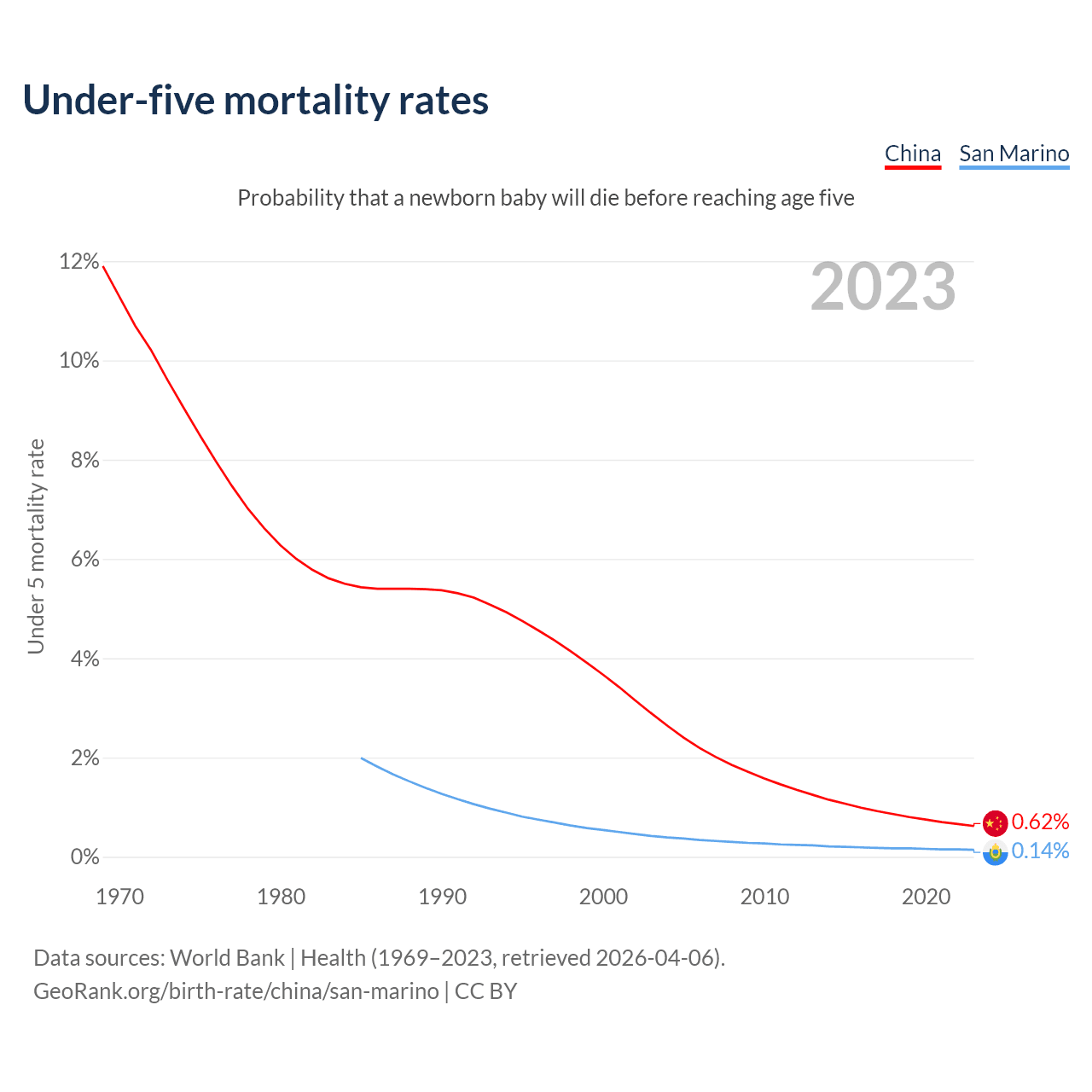 The chance that a newborn baby will die before reaching age five is 0.62% in China and 0.14% in San Marino. Above is a chart with historical data on under-five mortality rates.