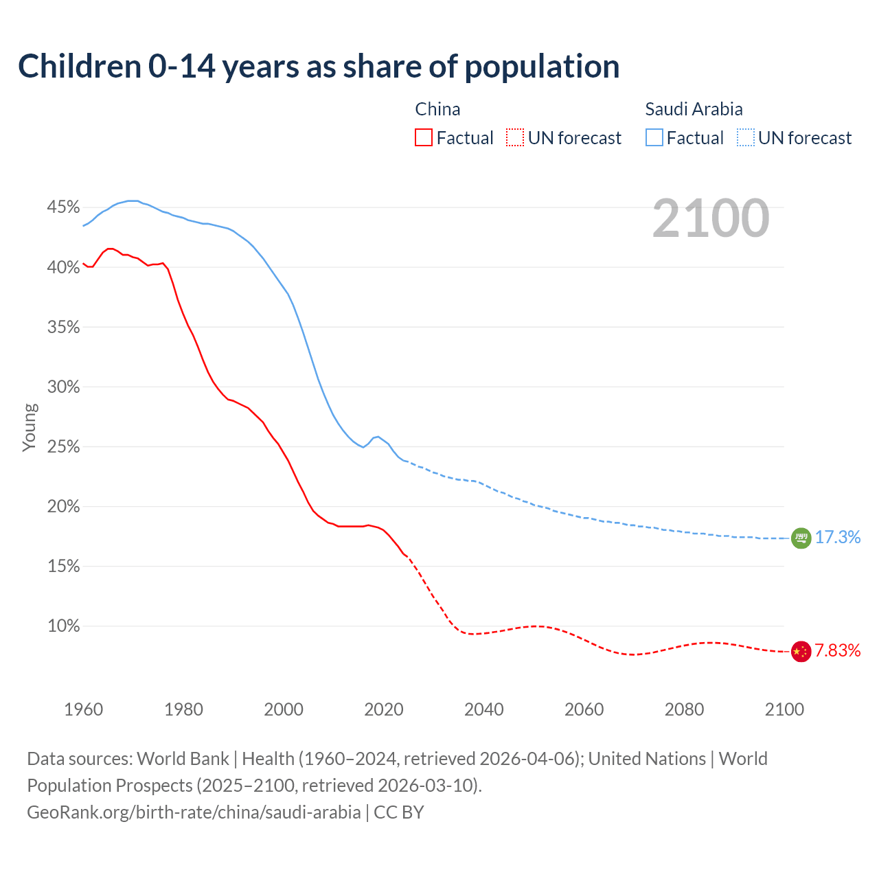 According to the latest available data on birth rates, the fertility rate in China was 1 children per woman in 2023, compared to 2.28 in Saudi Arabia in 2023. The replacement level is considered to be 2.1 children per woman.