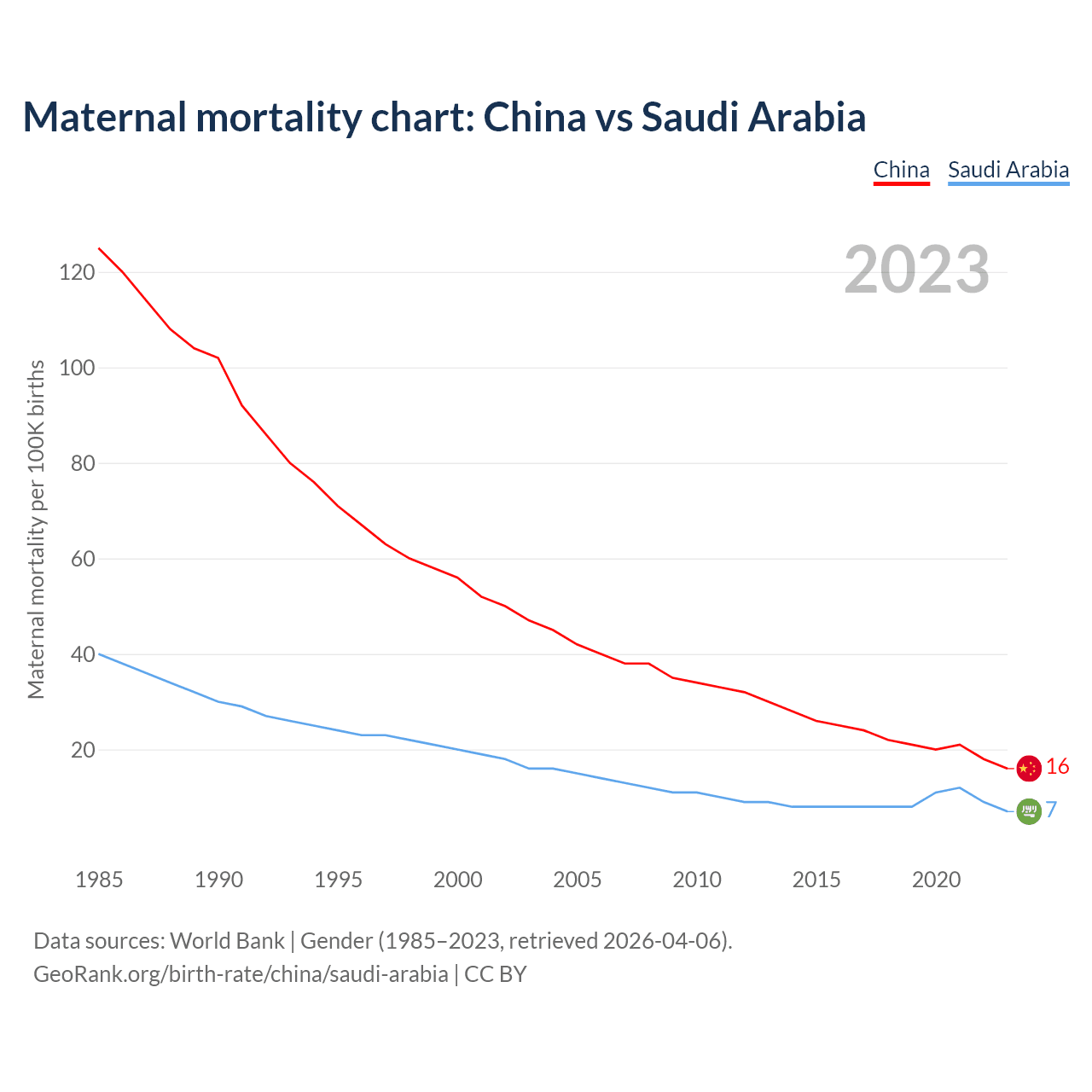 The maternal mortality rate, which is the probability of dying during childbirth or within 42 days of pregnancy termination, is 16 deaths per 100,000 live births in China, compared to 7 deaths in Saudi Arabia.