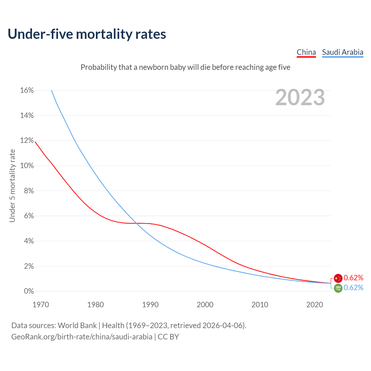 The chance that a newborn baby will die before reaching age five is 0.62% in China and 0.62% in Saudi Arabia. Above is a chart with historical data on under-five mortality rates.