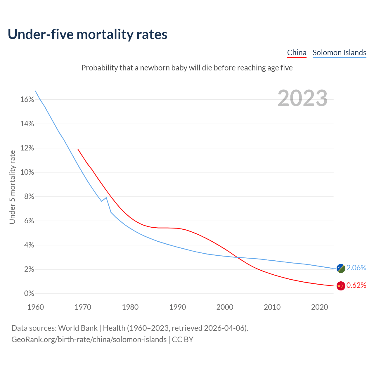 The chance that a newborn baby will die before reaching age five is 0.62% in China and 2.06% in the Solomon Islands. Above is a chart with historical data on under-five mortality rates.