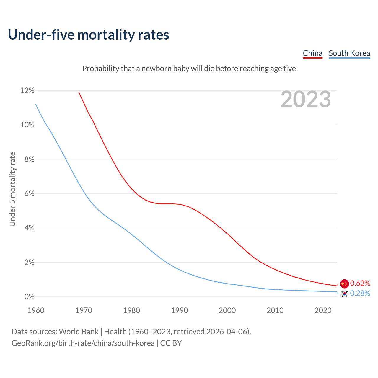 The chance that a newborn baby will die before reaching age five is 0.62% in China and 0.28% in South Korea. Above is a chart with historical data on under-five mortality rates.