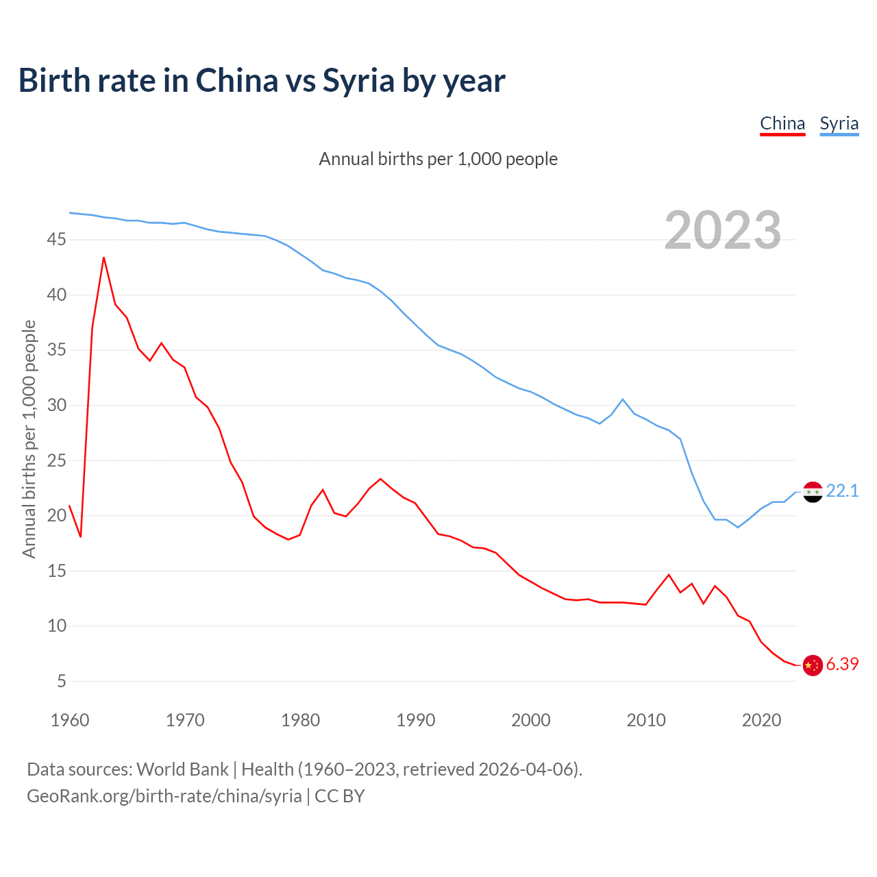 According to the latest available data on birth rates, the fertility rate in China was 1 children per woman in 2023, compared to 2.71 in Syria in 2023. The replacement level is considered to be 2.1 children per woman.
