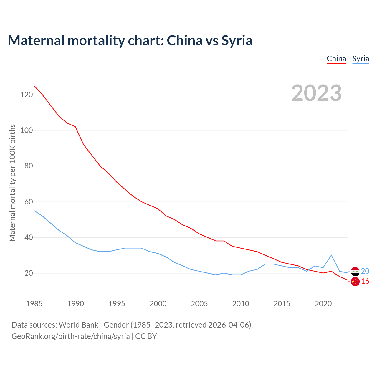 The maternal mortality rate, which is the probability of dying during childbirth or within 42 days of pregnancy termination, is 16 deaths per 100,000 live births in China, compared to 20 deaths in Syria.