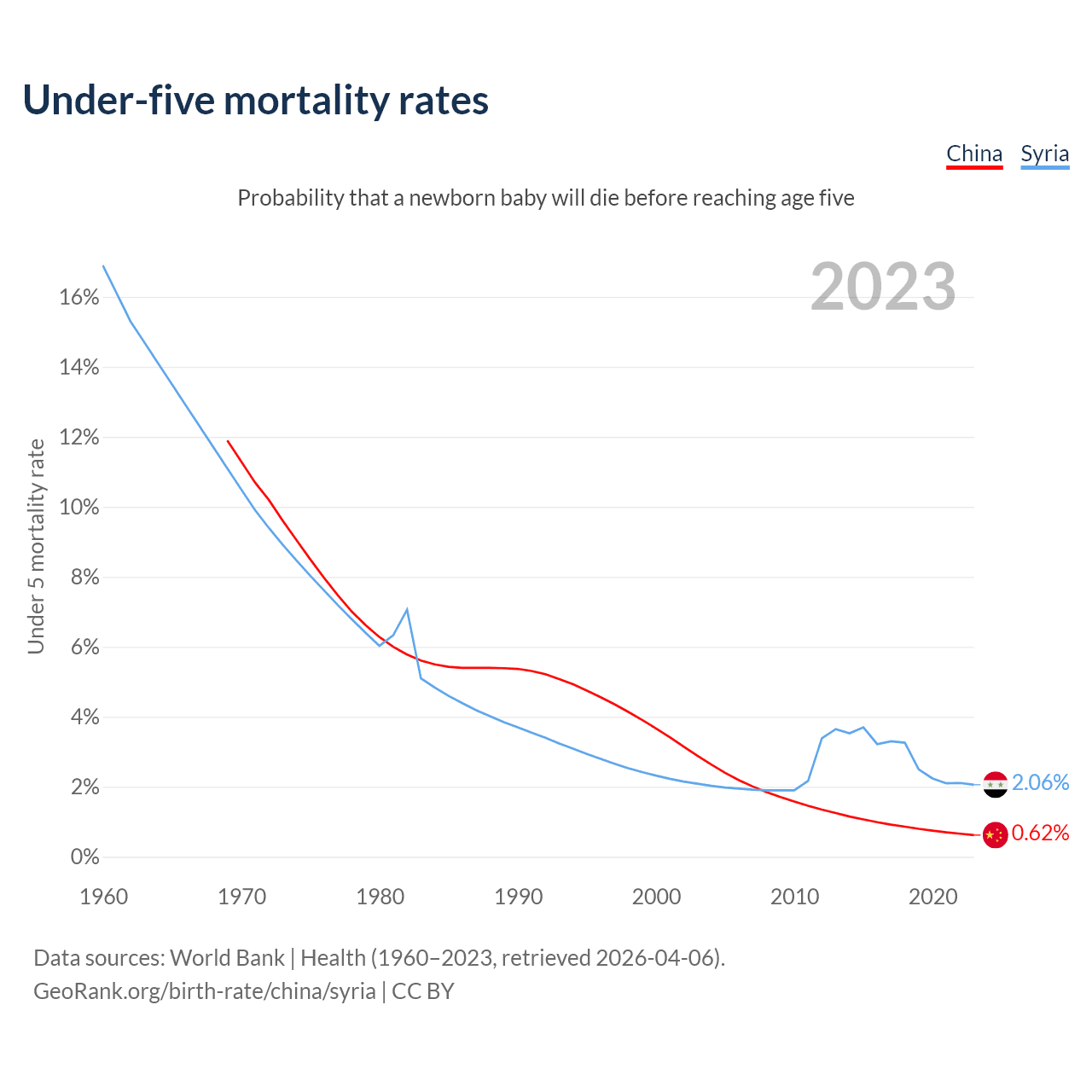 The chance that a newborn baby will die before reaching age five is 0.62% in China and 2.06% in Syria. Above is a chart with historical data on under-five mortality rates.