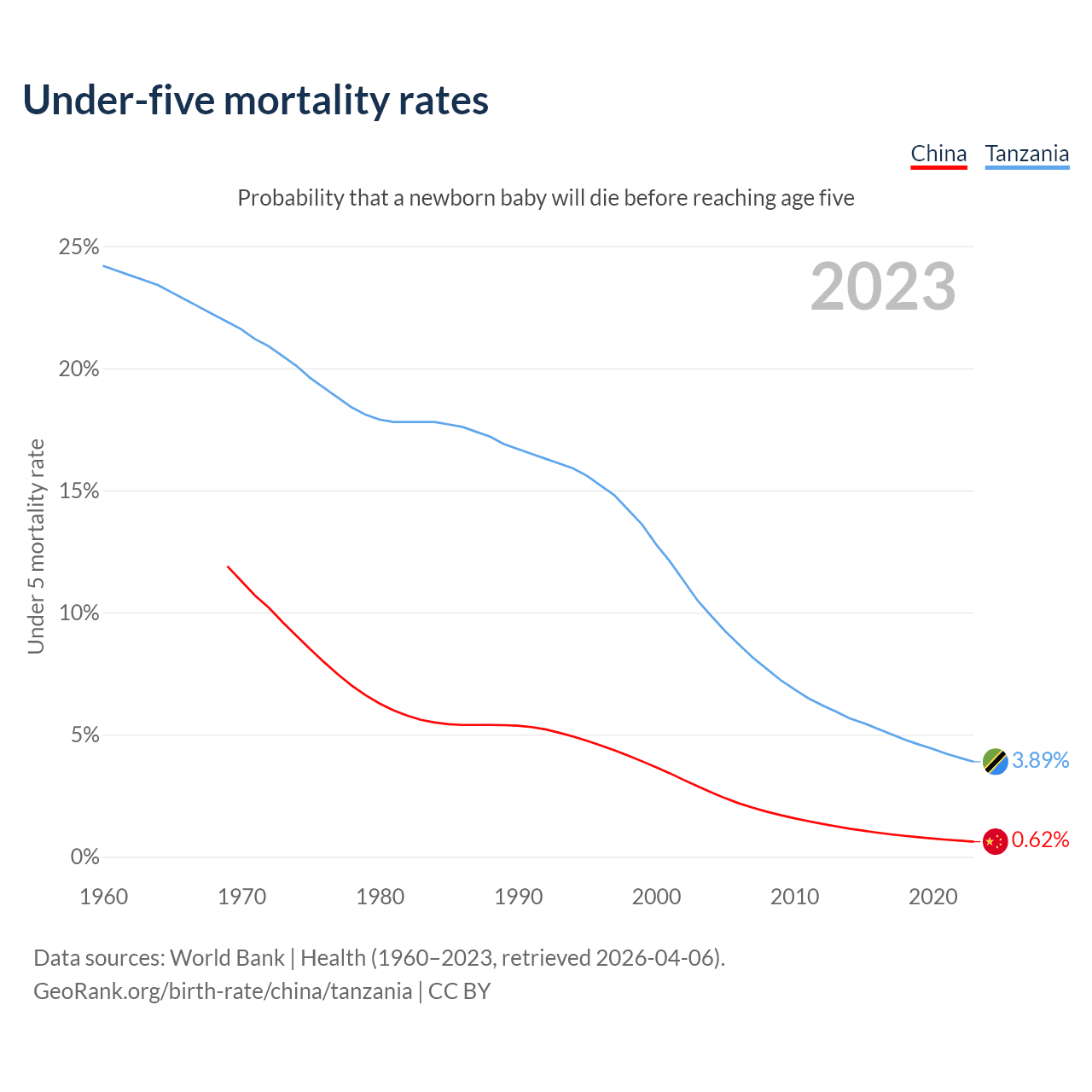 The chance that a newborn baby will die before reaching age five is 0.62% in China and 3.89% in Tanzania. Above is a chart with historical data on under-five mortality rates.