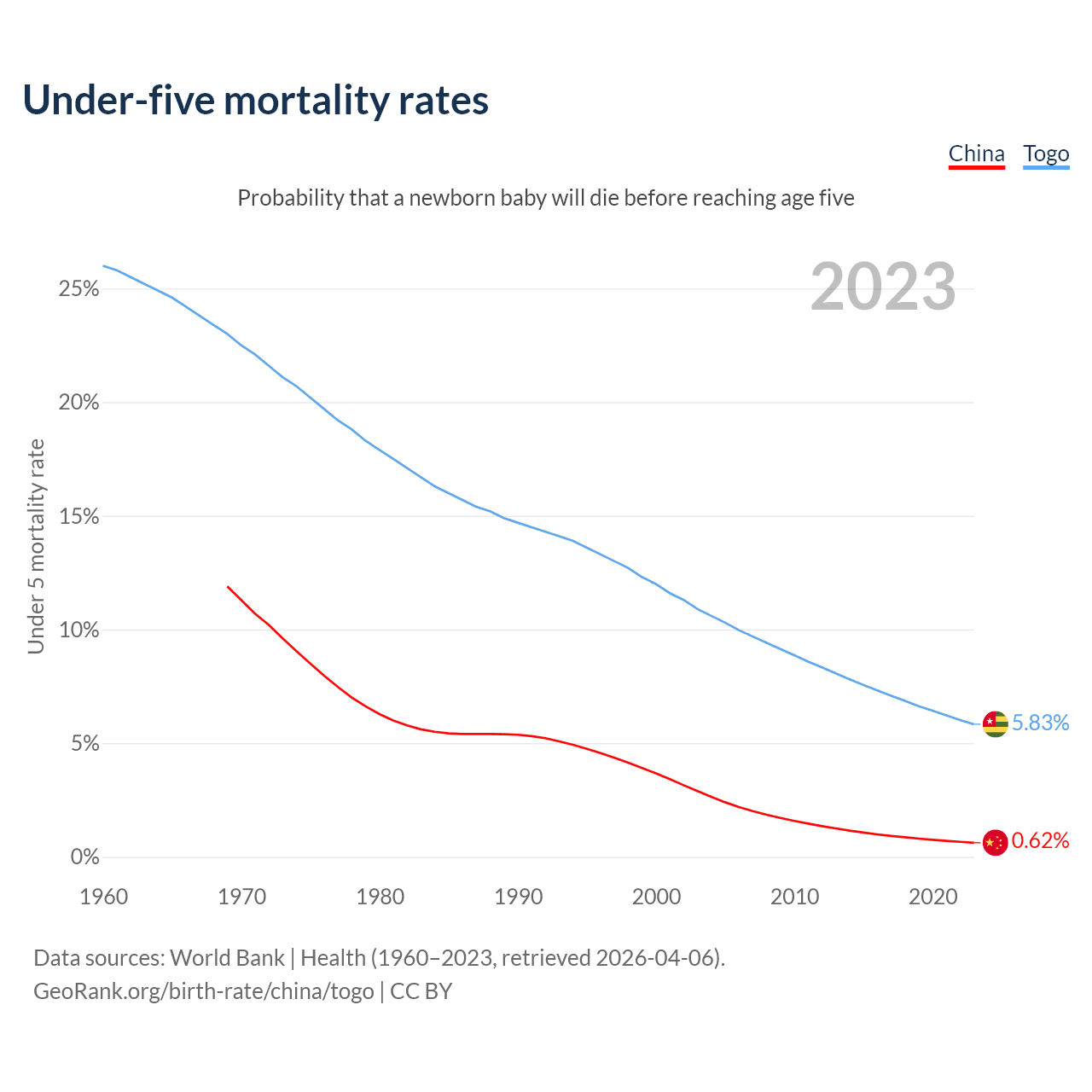 The chance that a newborn baby will die before reaching age five is 0.62% in China and 5.83% in Togo. Above is a chart with historical data on under-five mortality rates.