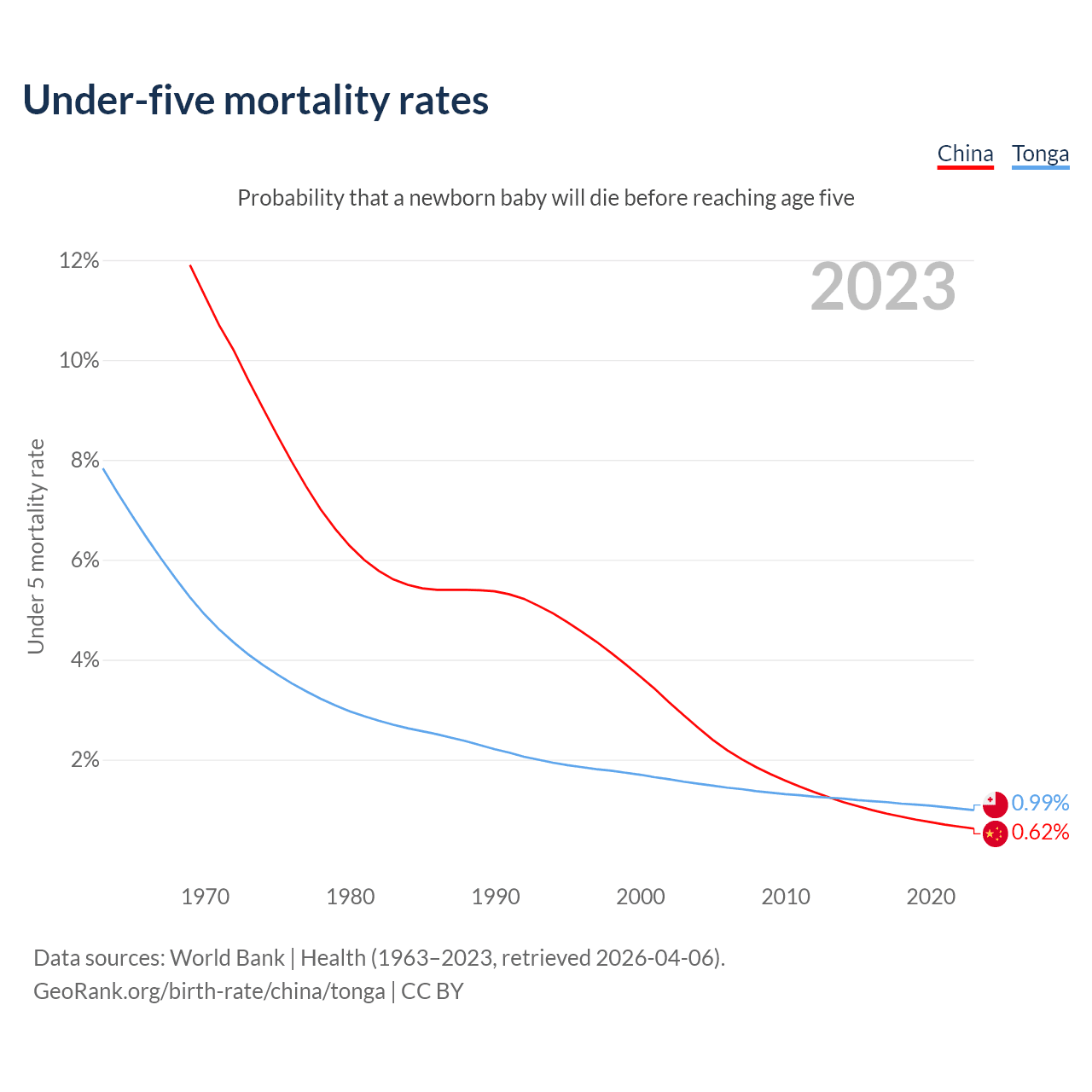 The chance that a newborn baby will die before reaching age five is 0.62% in China and 0.99% in Tonga. Above is a chart with historical data on under-five mortality rates.