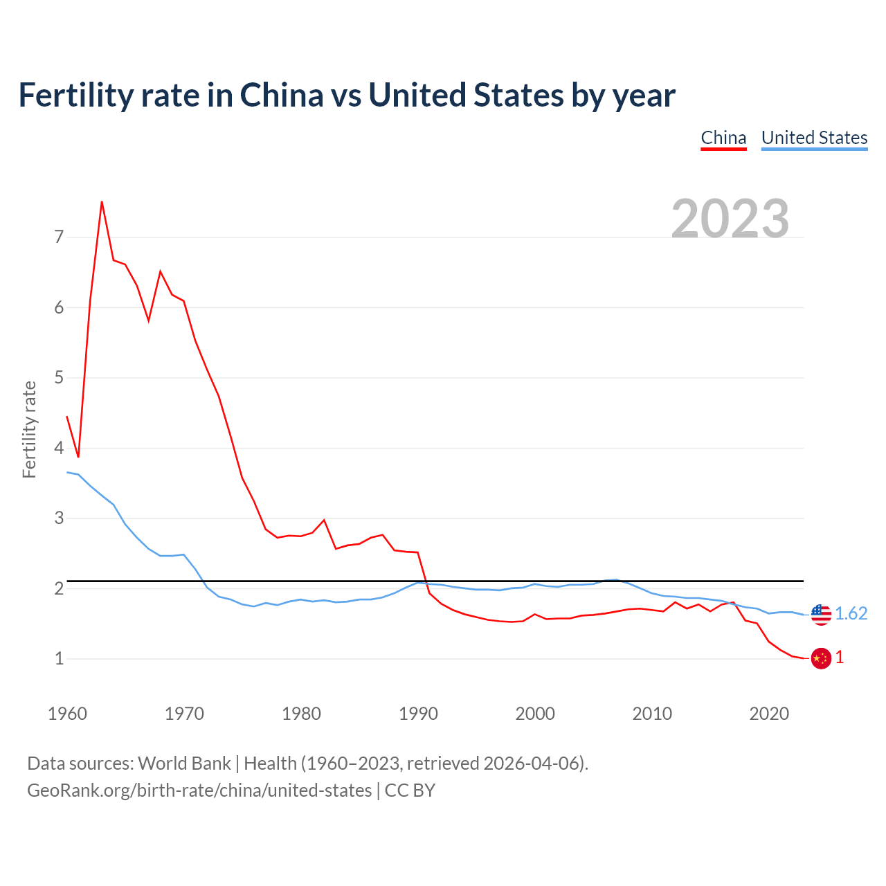 According to the latest available data on birth rates, the fertility rate in China was 1 children per woman in 2023, compared to 1.62 in the United States in 2023. The replacement level is considered to be 2.1 children per woman.