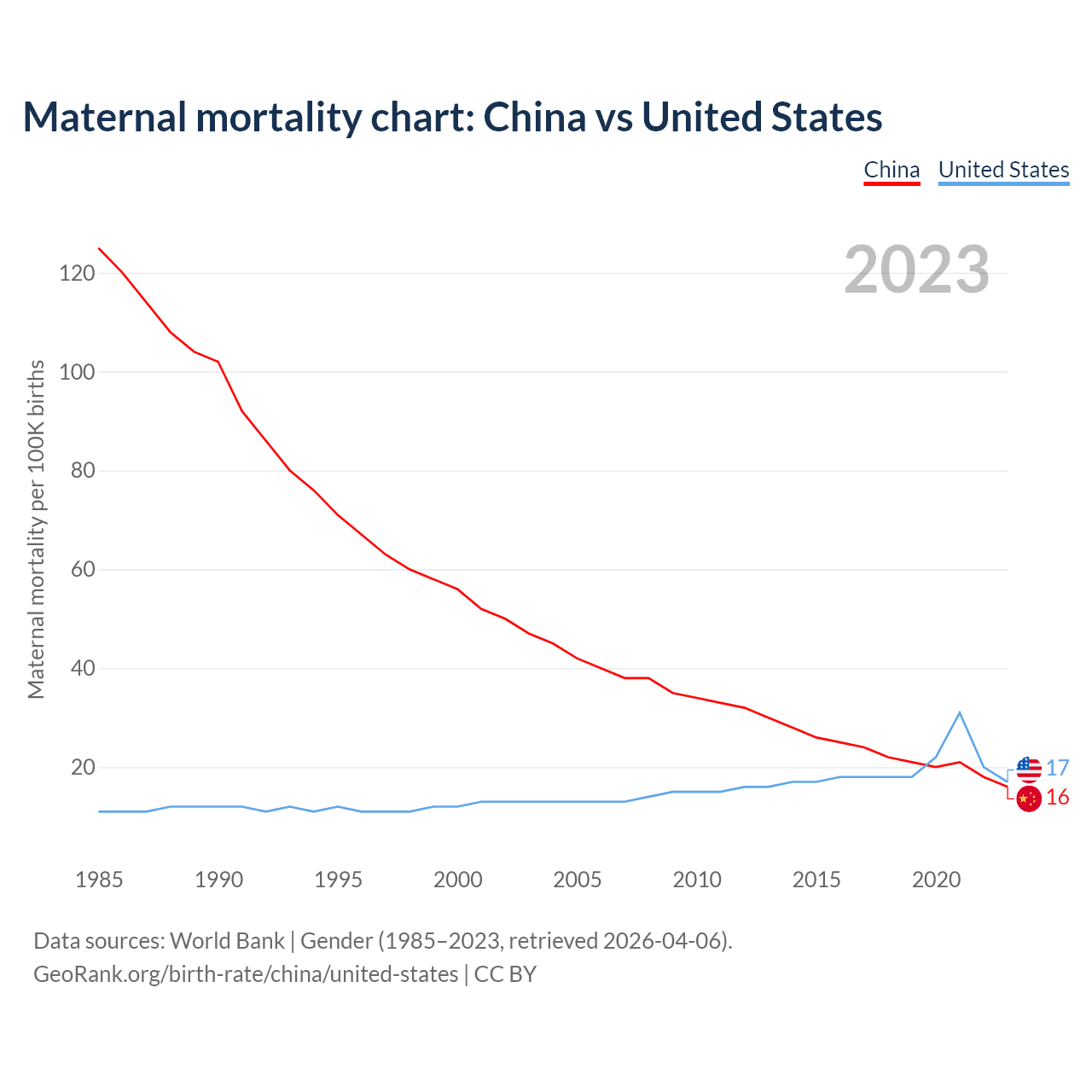The maternal mortality rate, which is the probability of dying during childbirth or within 42 days of pregnancy termination, is 16 deaths per 100,000 live births in China, compared to 17 deaths in the United States.