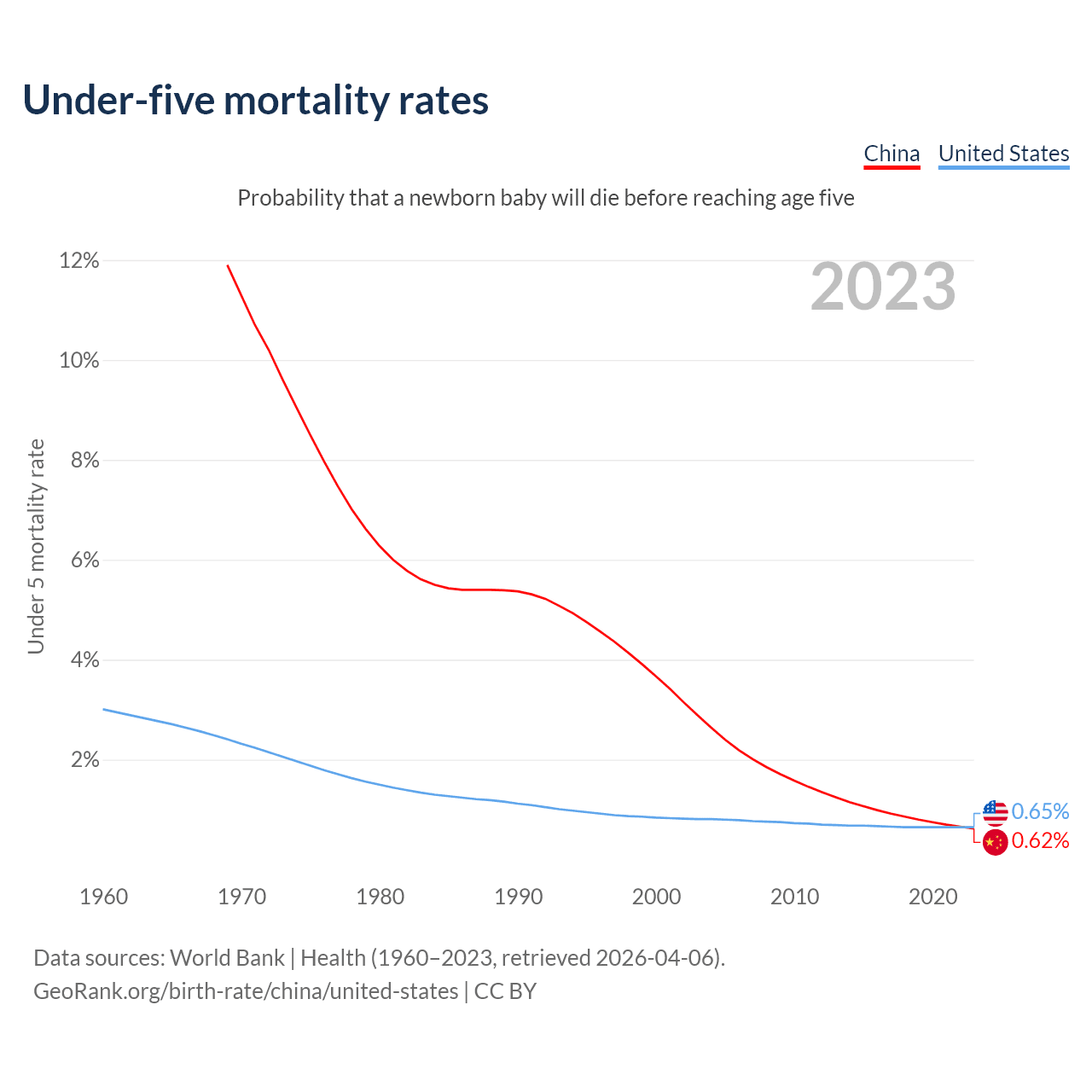 The chance that a newborn baby will die before reaching age five is 0.62% in China and 0.65% in the United States. Above is a chart with historical data on under-five mortality rates.