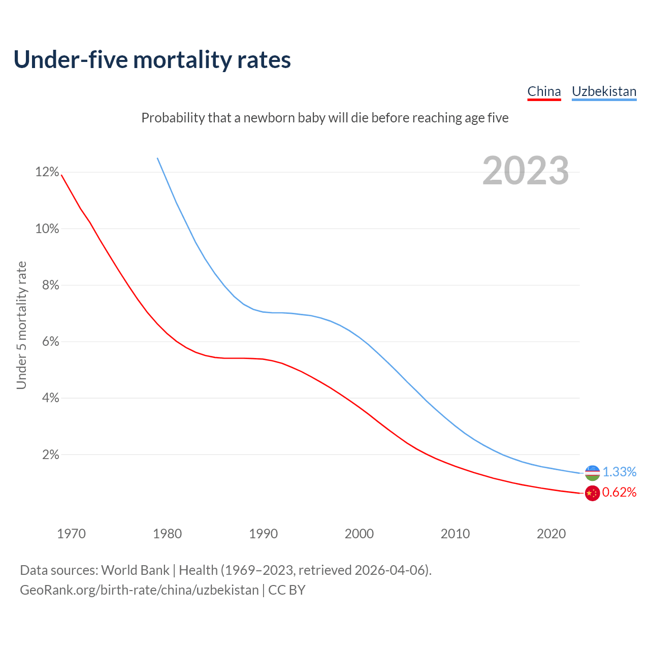 The chance that a newborn baby will die before reaching age five is 0.62% in China and 1.33% in Uzbekistan. Above is a chart with historical data on under-five mortality rates.
