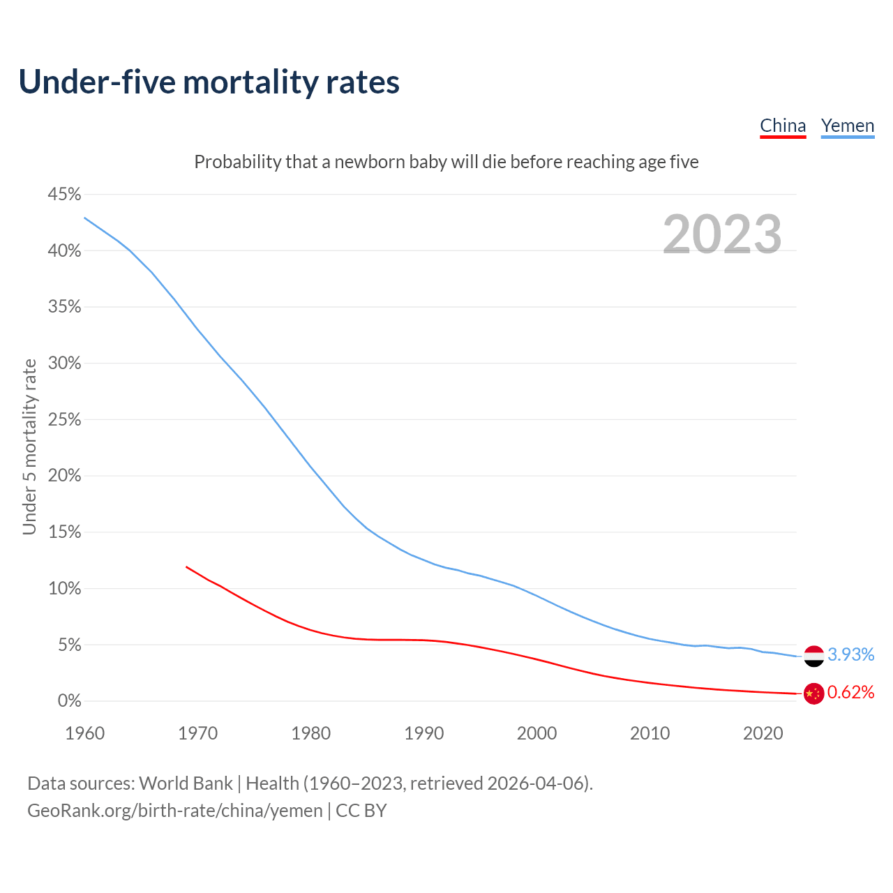 The chance that a newborn baby will die before reaching age five is 0.62% in China and 3.93% in Yemen. Above is a chart with historical data on under-five mortality rates.