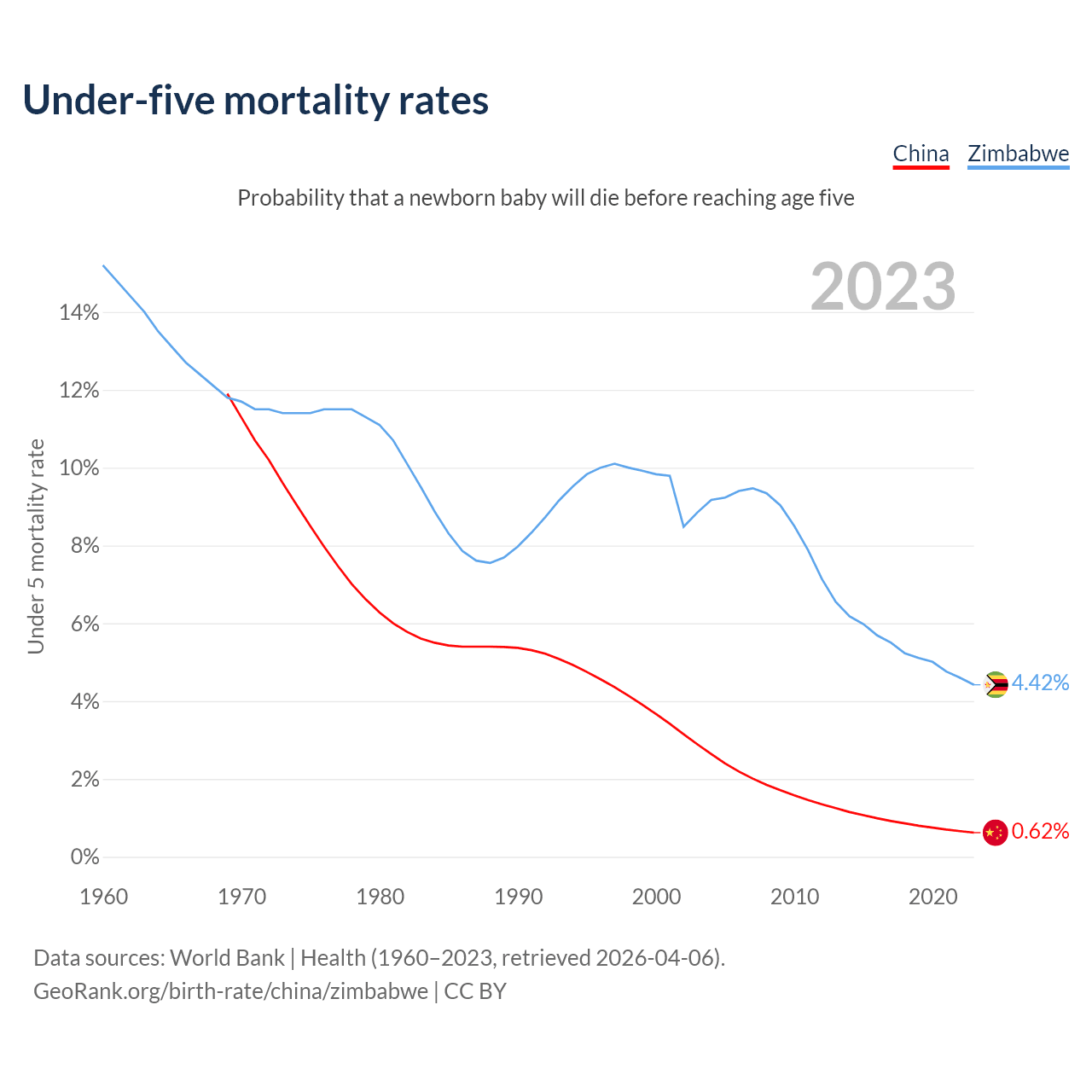 The chance that a newborn baby will die before reaching age five is 0.62% in China and 4.42% in Zimbabwe. Above is a chart with historical data on under-five mortality rates.