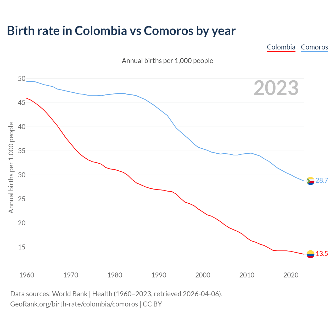 Colombia has an annual birth rate of 13.5 births per 1,000 people, compared to 28.7 for Comoros. The average number of children a woman is expected to have during her lifetime — the fertility rate, is 1.65 in Colombia and 3.88 in Comoros — 135.7% difference.