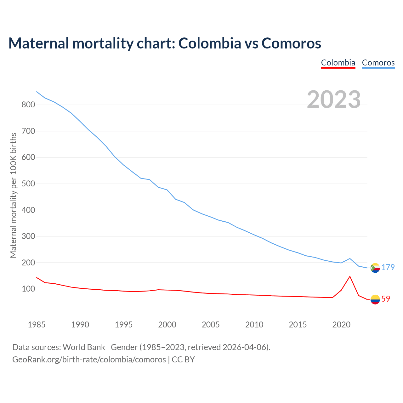 The maternal mortality rate, which is the probability of dying during childbirth or within 42 days of pregnancy termination, is 59 deaths per 100,000 live births in Colombia, compared to 179 deaths in Comoros.