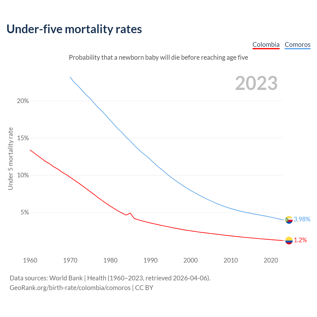 The chance that a newborn baby will die before reaching age five is 1.2% in Colombia and 3.98% in Comoros. Above is a chart with historical data on under-five mortality rates.