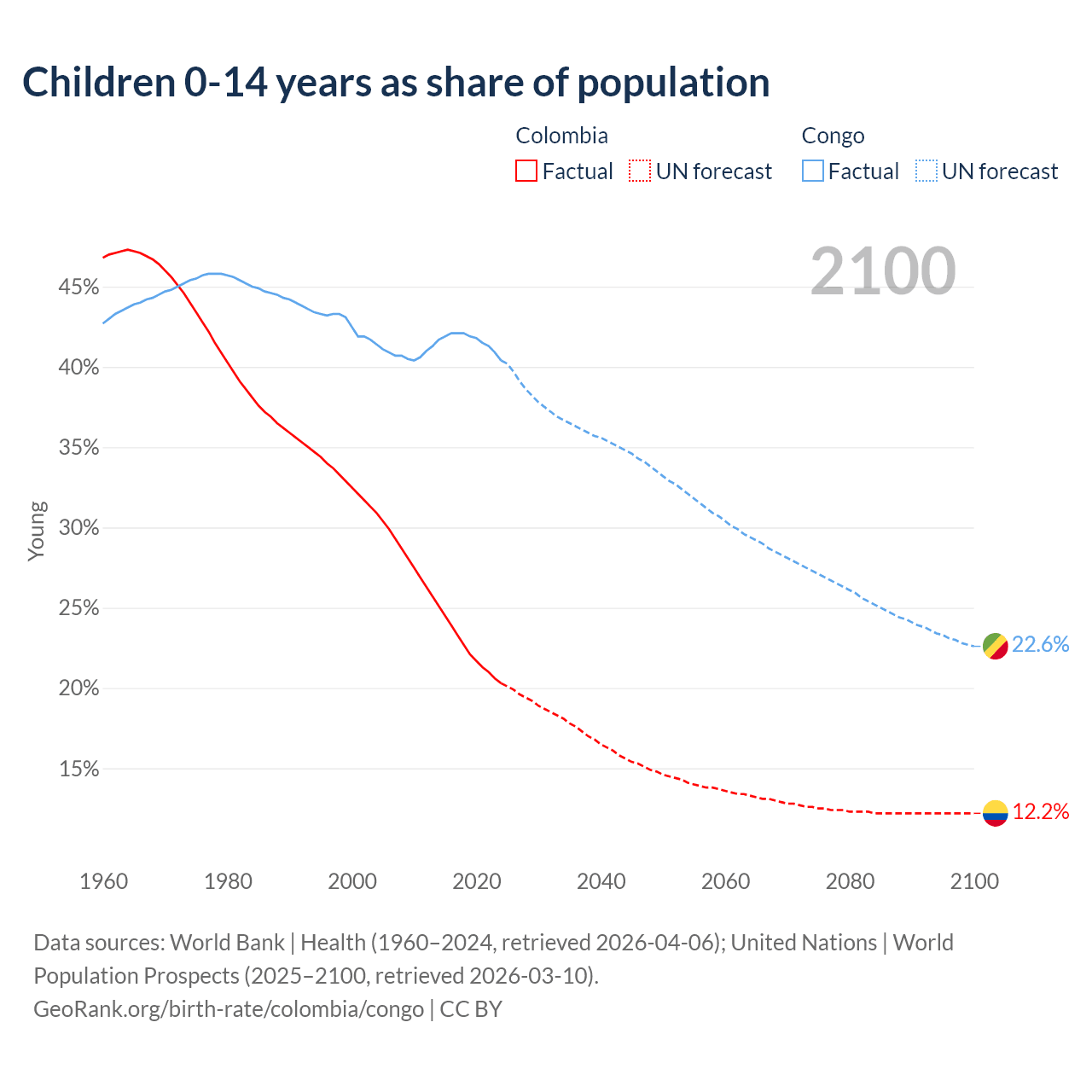 According to the latest available data on birth rates, the fertility rate in Colombia was 1.65 children per woman in 2023, compared to 4.16 in the Congo in 2023. The replacement level is considered to be 2.1 children per woman.