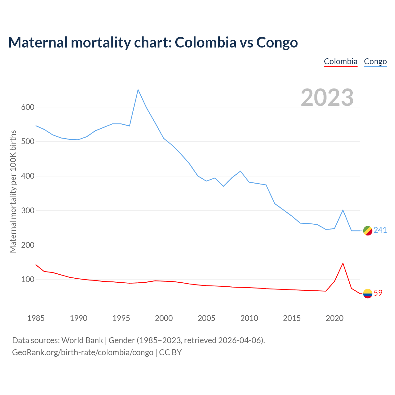 The maternal mortality rate, which is the probability of dying during childbirth or within 42 days of pregnancy termination, is 59 deaths per 100,000 live births in Colombia, compared to 241 deaths in the Congo.