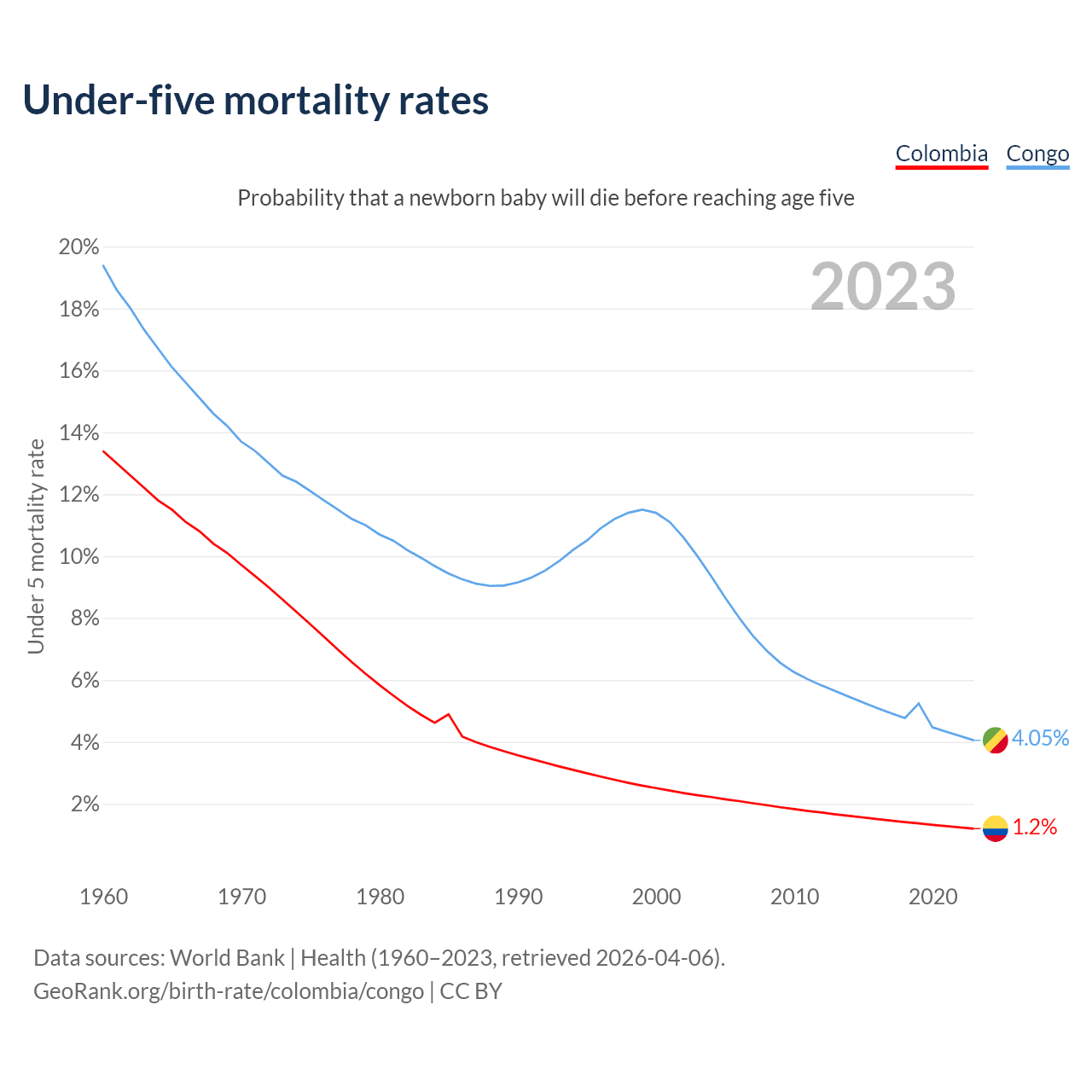 The chance that a newborn baby will die before reaching age five is 1.2% in Colombia and 4.05% in the Congo. Above is a chart with historical data on under-five mortality rates.