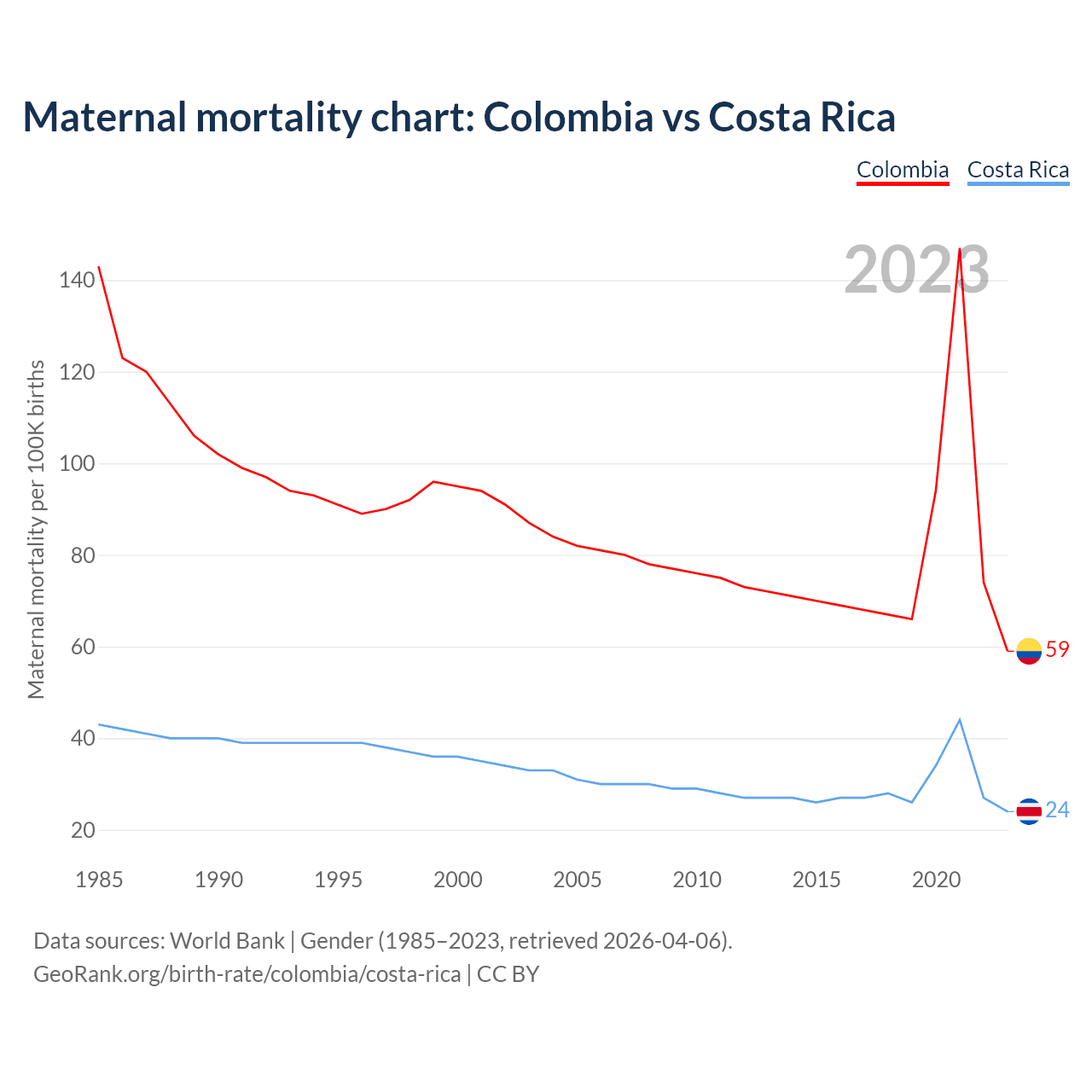 The maternal mortality rate, which is the probability of dying during childbirth or within 42 days of pregnancy termination, is 59 deaths per 100,000 live births in Colombia, compared to 24 deaths in Costa Rica.
