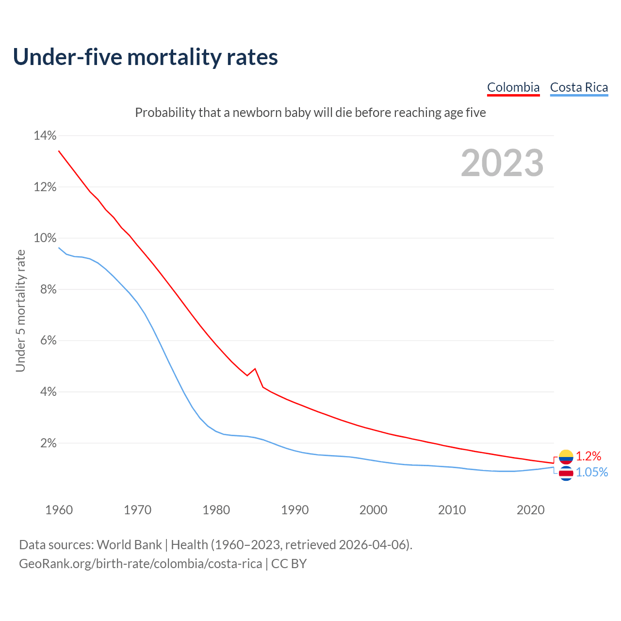 The chance that a newborn baby will die before reaching age five is 1.2% in Colombia and 1.05% in Costa Rica. Above is a chart with historical data on under-five mortality rates.