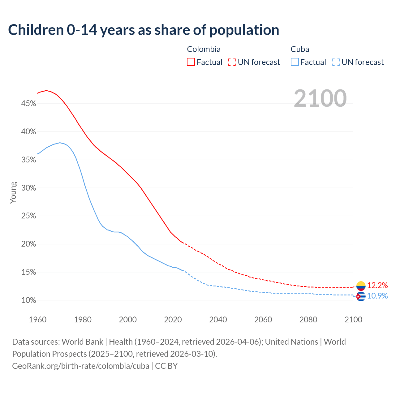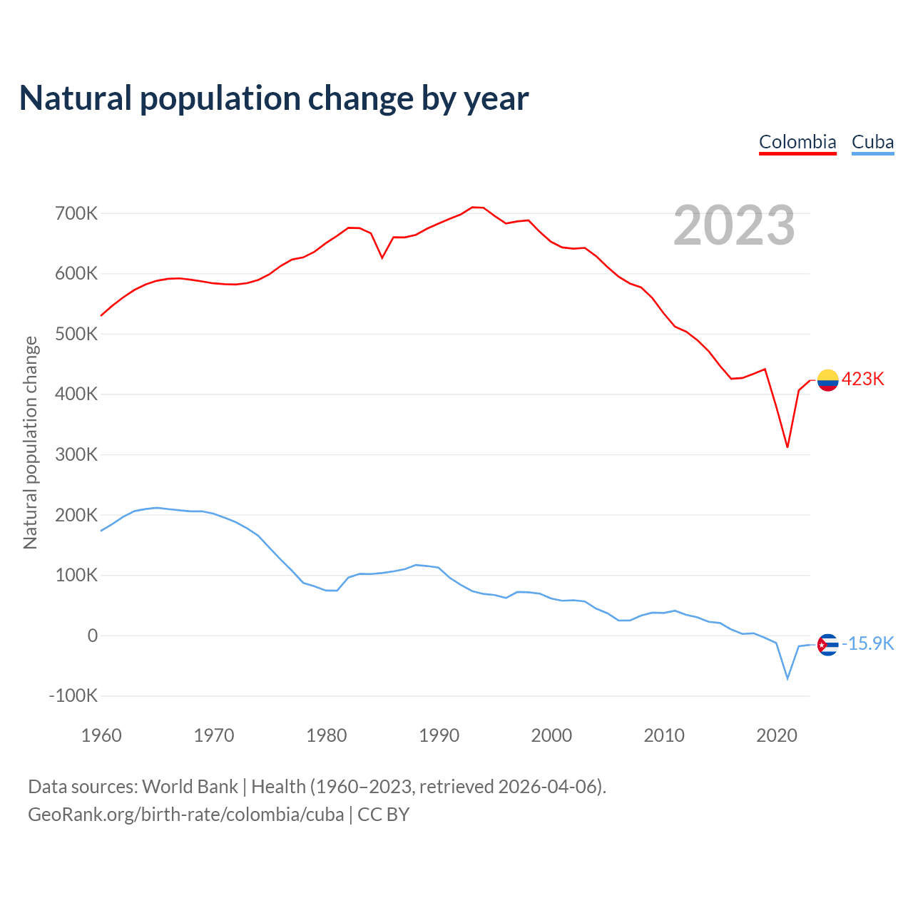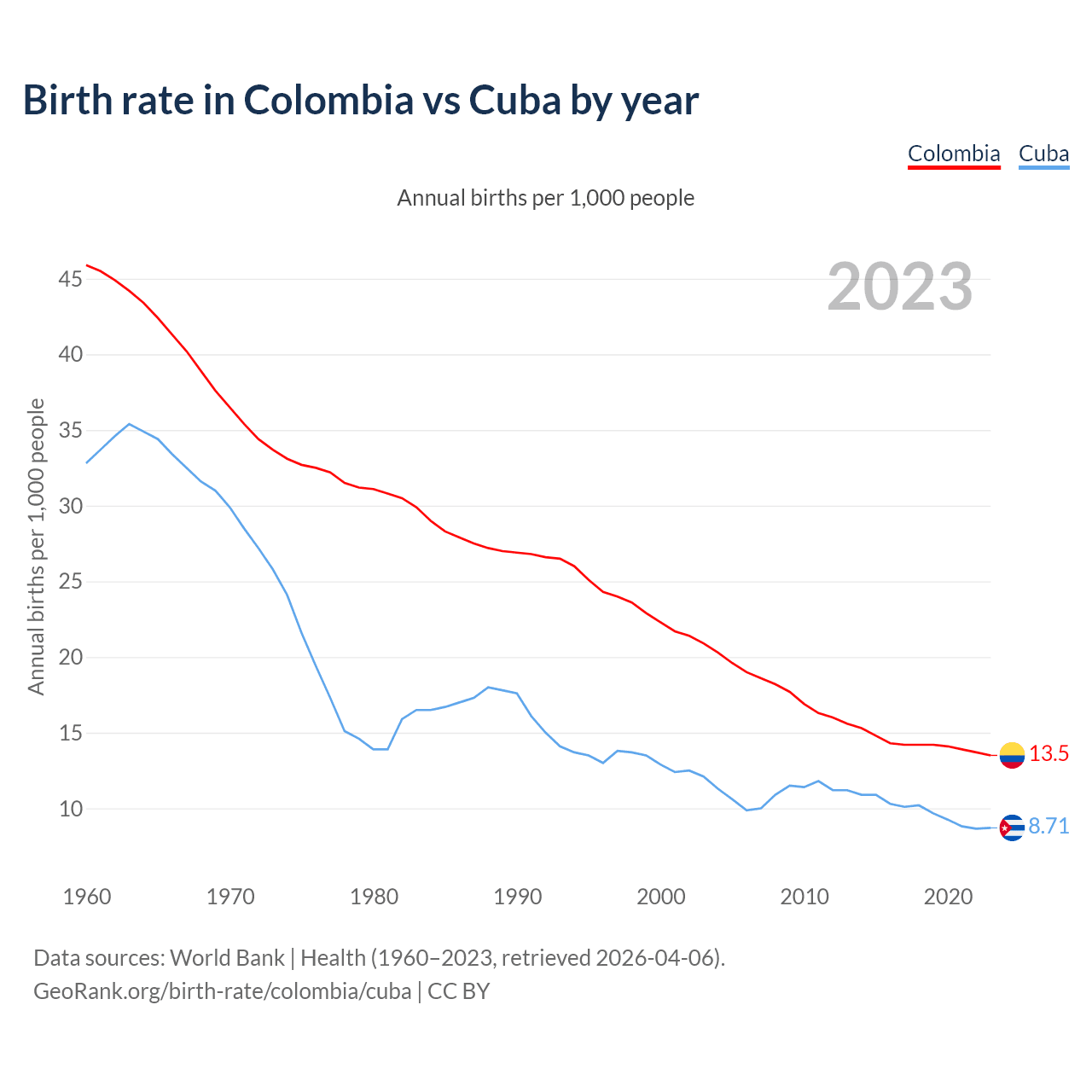 According to the latest available data on birth rates, the fertility rate in Colombia was 1.65 children per woman in 2023, compared to 1.44 in Cuba in 2023. The replacement level is considered to be 2.1 children per woman.