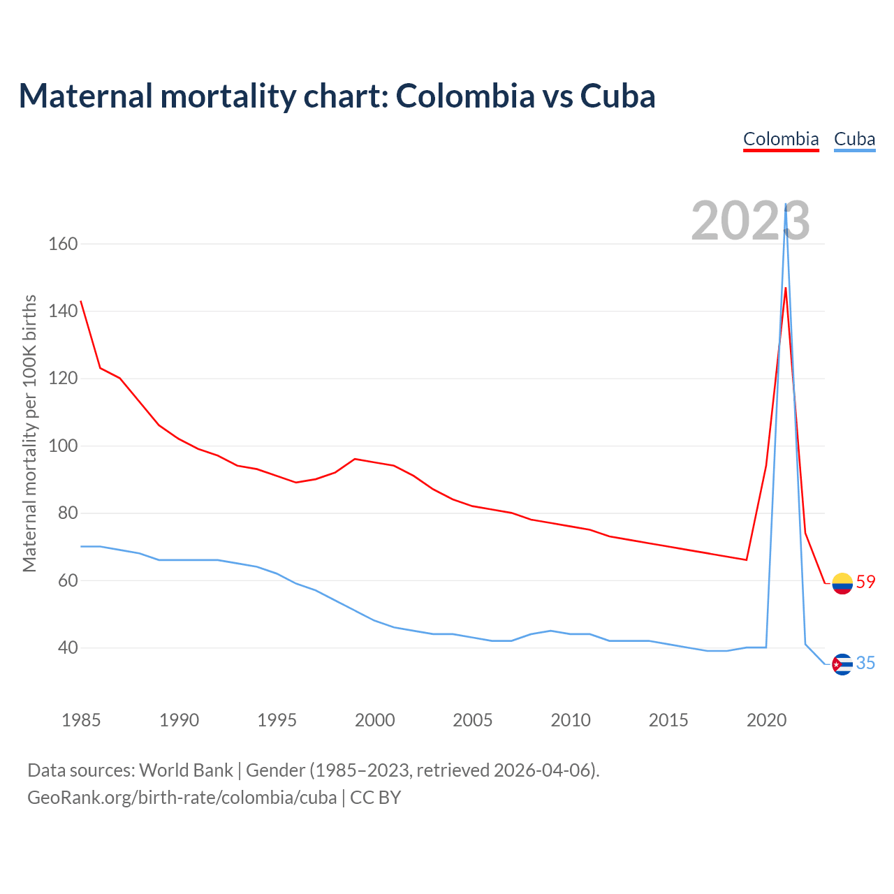The maternal mortality rate, which is the probability of dying during childbirth or within 42 days of pregnancy termination, is 59 deaths per 100,000 live births in Colombia, compared to 35 deaths in Cuba.