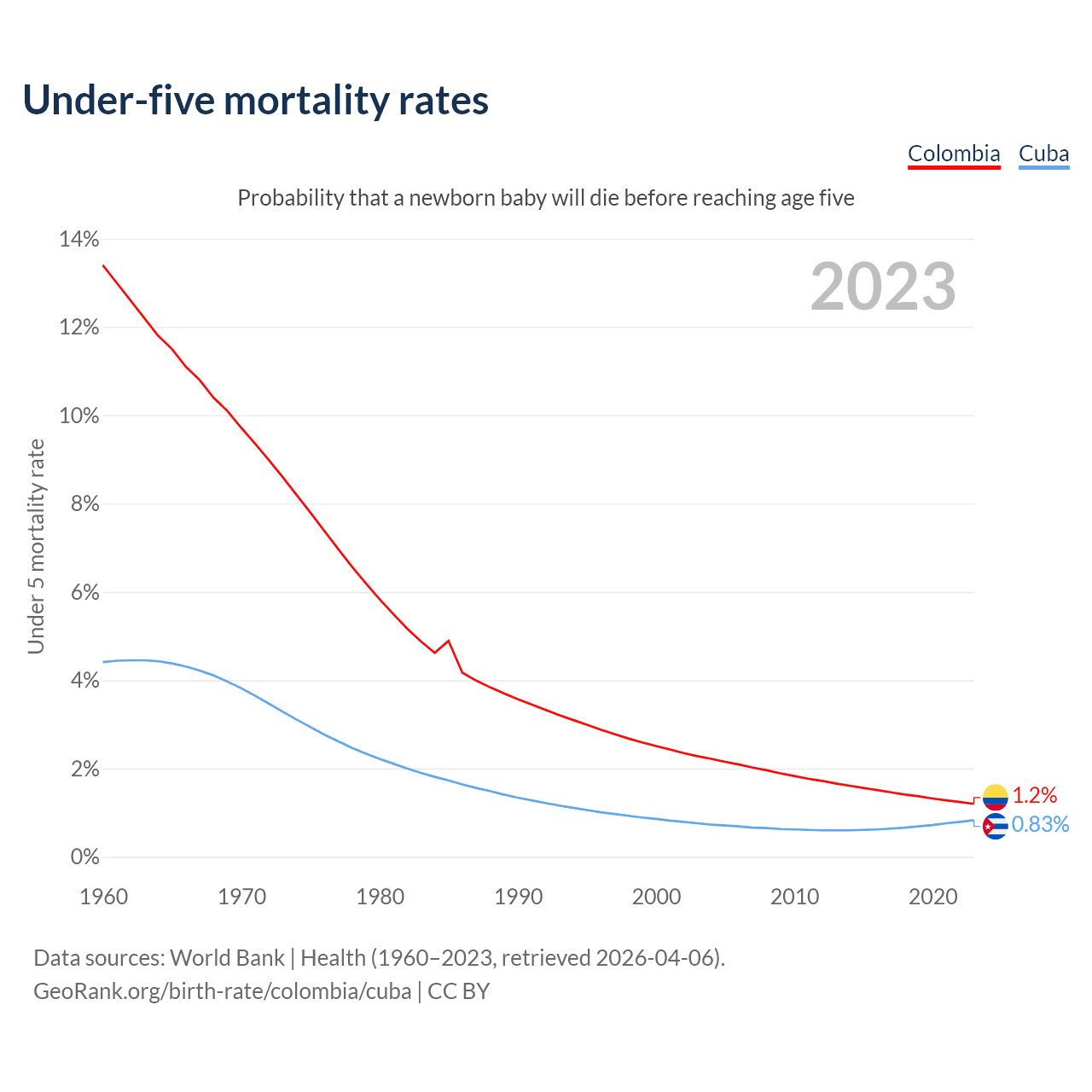 The chance that a newborn baby will die before reaching age five is 1.2% in Colombia and 0.83% in Cuba. Above is a chart with historical data on under-five mortality rates.