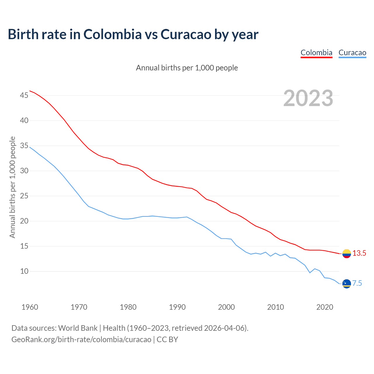 1960 vs 2023, the fertility rate has decreased by 75.6% in Colombia and by 76.6% in Curacao — in 1960, it was 6.74 and 5.13, respectively.