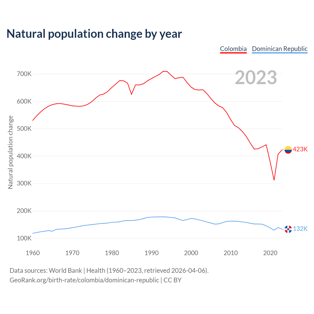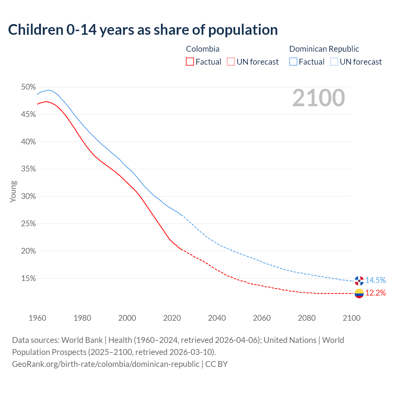 According to the latest available data on birth rates, the fertility rate in Colombia was 1.65 children per woman in 2023, compared to 2.24 in the Dominican Republic in 2023. The replacement level is considered to be 2.1 children per woman.