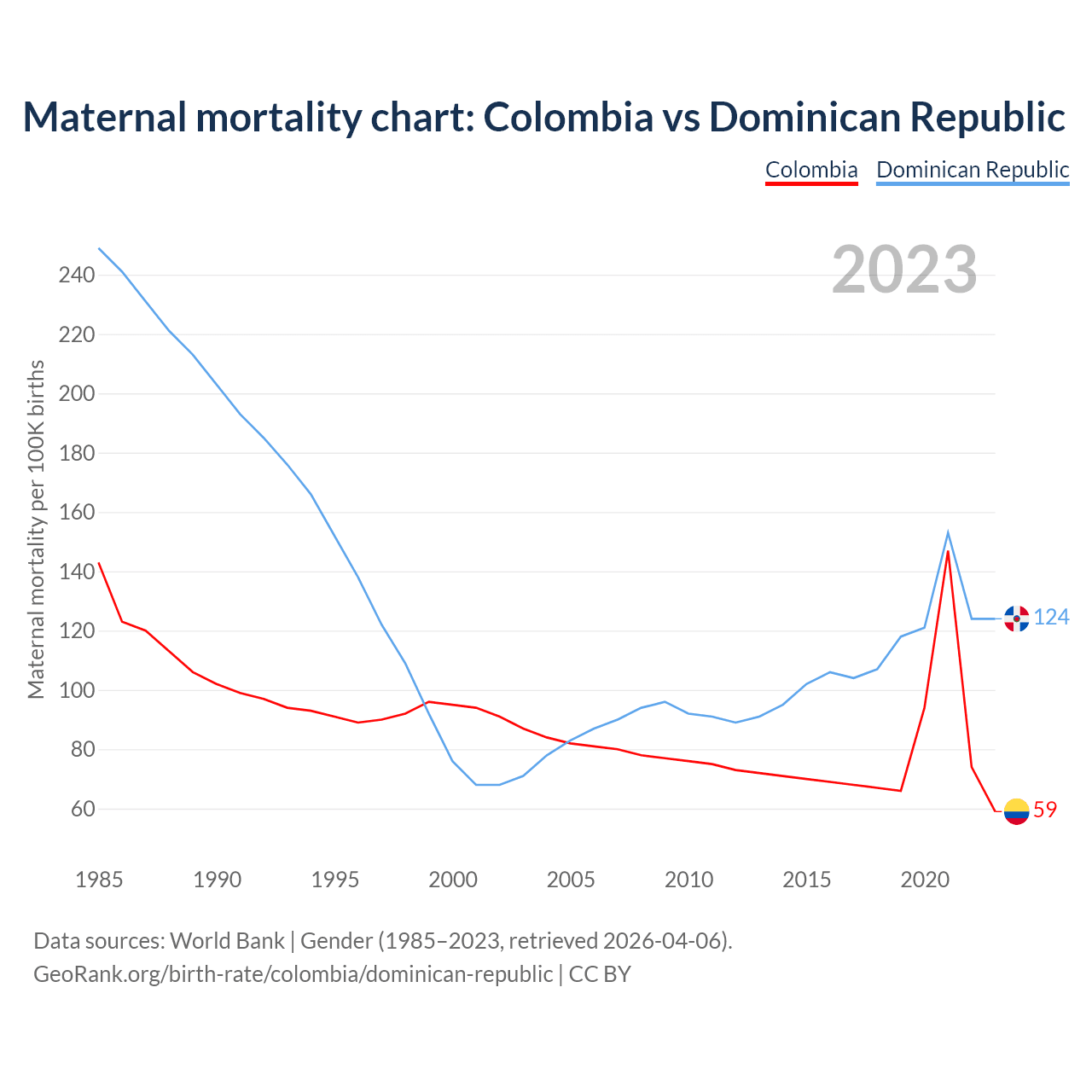 The maternal mortality rate, which is the probability of dying during childbirth or within 42 days of pregnancy termination, is 59 deaths per 100,000 live births in Colombia, compared to 124 deaths in the Dominican Republic.