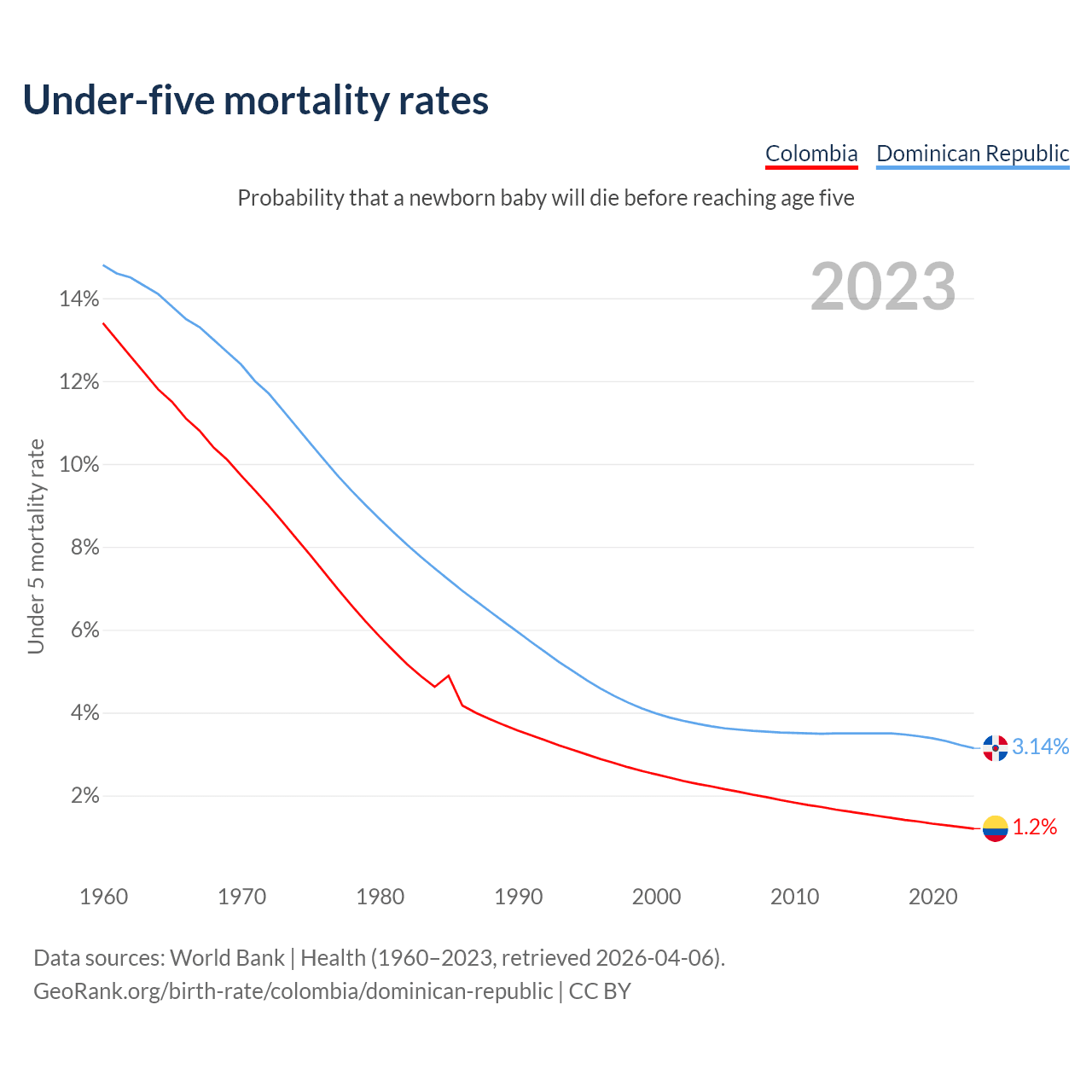 The chance that a newborn baby will die before reaching age five is 1.2% in Colombia and 3.14% in the Dominican Republic. Above is a chart with historical data on under-five mortality rates.