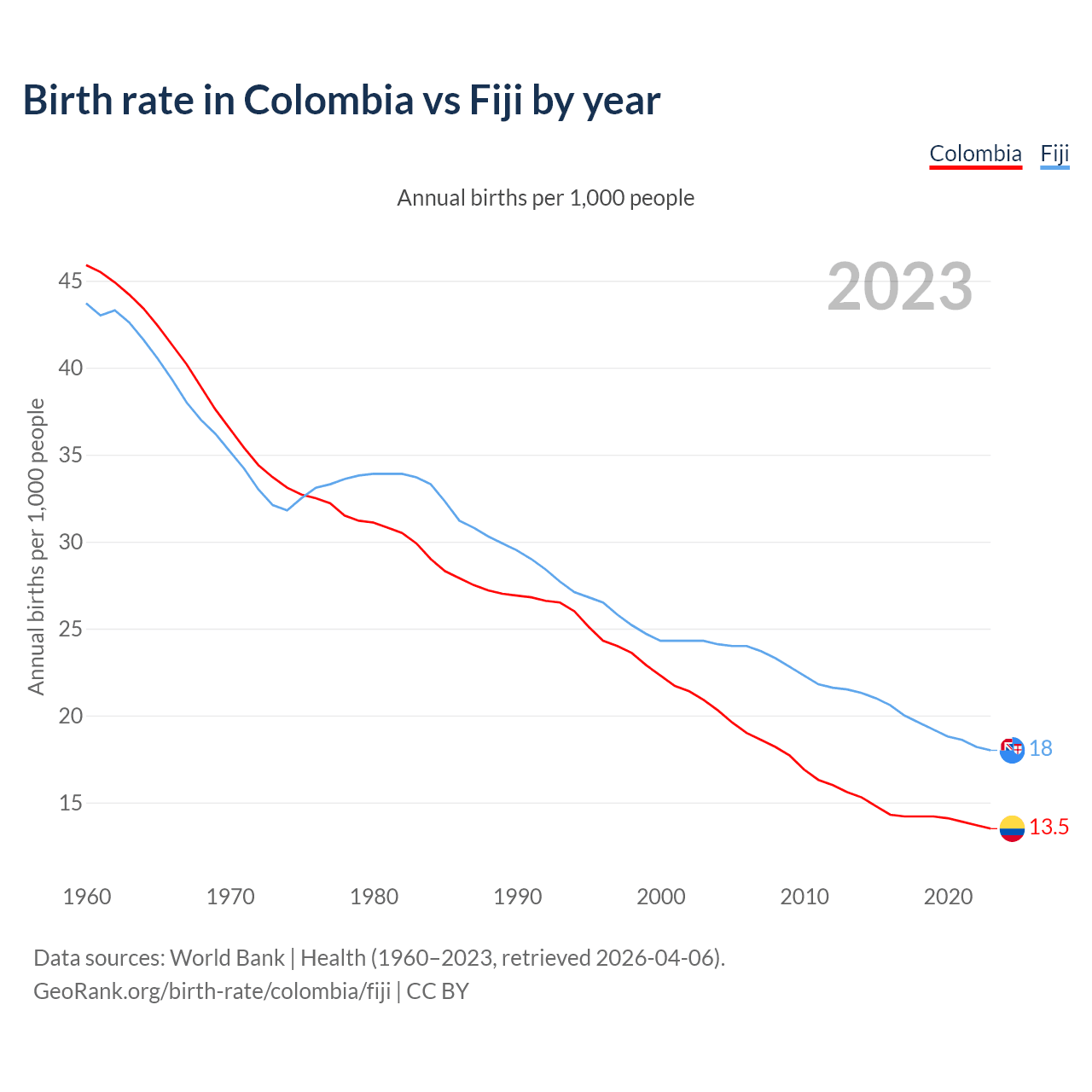 Colombia has an annual birth rate of 13.5 births per 1,000 people, compared to 18 for Fiji. The average number of children a woman is expected to have during her lifetime — the fertility rate, is 1.65 in Colombia and 2.28 in Fiji — 38.7% difference.