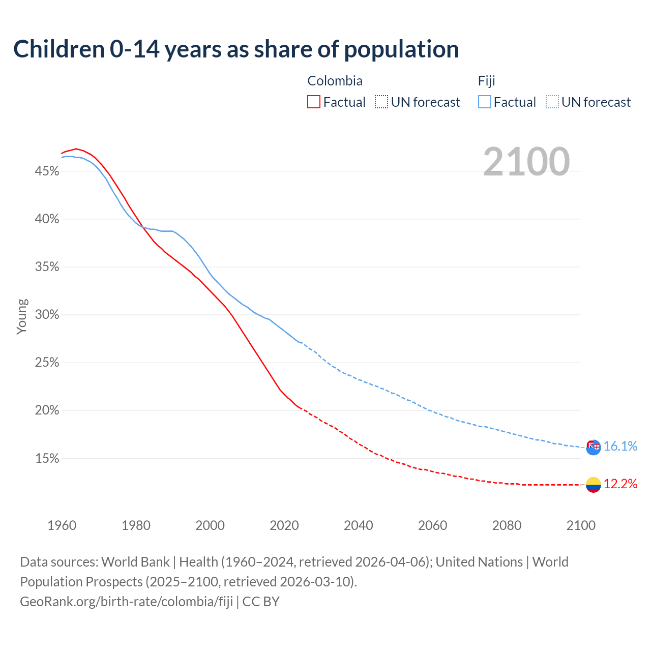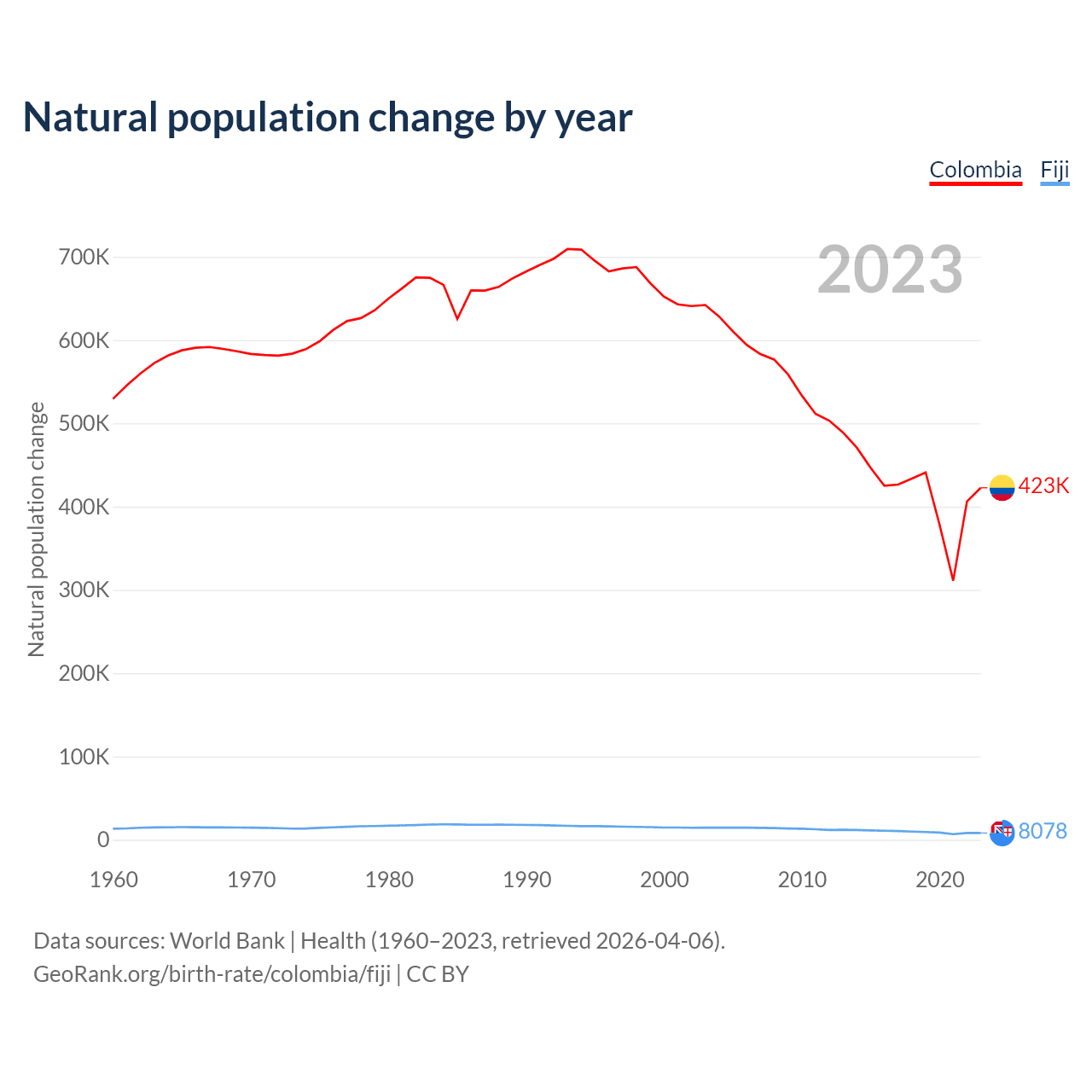 According to the latest available data on birth rates, the fertility rate in Colombia was 1.65 children per woman in 2023, compared to 2.28 in Fiji in 2023. The replacement level is considered to be 2.1 children per woman.