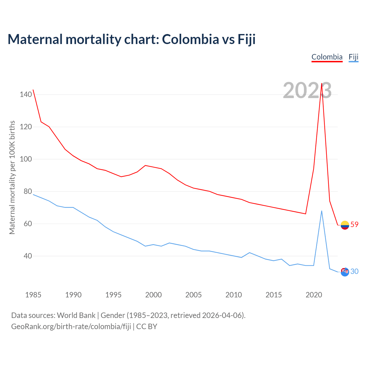 The maternal mortality rate, which is the probability of dying during childbirth or within 42 days of pregnancy termination, is 59 deaths per 100,000 live births in Colombia, compared to 30 deaths in Fiji.