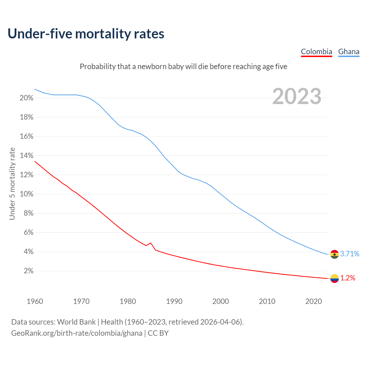 The chance that a newborn baby will die before reaching age five is 1.2% in Colombia and 3.71% in Ghana. Above is a chart with historical data on under-five mortality rates.