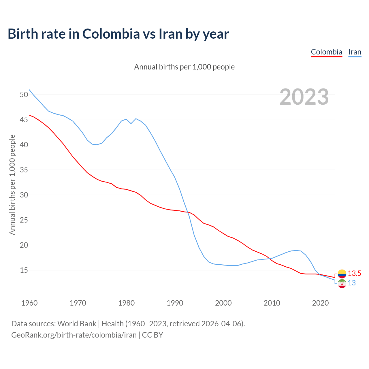 Colombia has an annual birth rate of 13.5 births per 1,000 people, compared to 13 for Iran. The average number of children a woman is expected to have during her lifetime — the fertility rate, is 1.65 in Colombia and 1.7 in Iran — 3.04% difference.