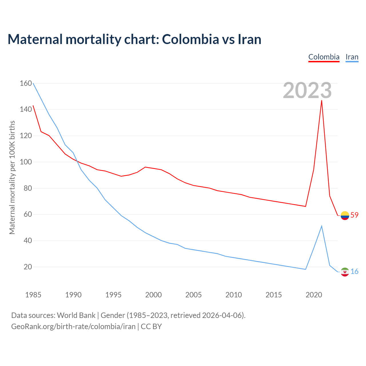 The maternal mortality rate, which is the probability of dying during childbirth or within 42 days of pregnancy termination, is 59 deaths per 100,000 live births in Colombia, compared to 16 deaths in Iran.