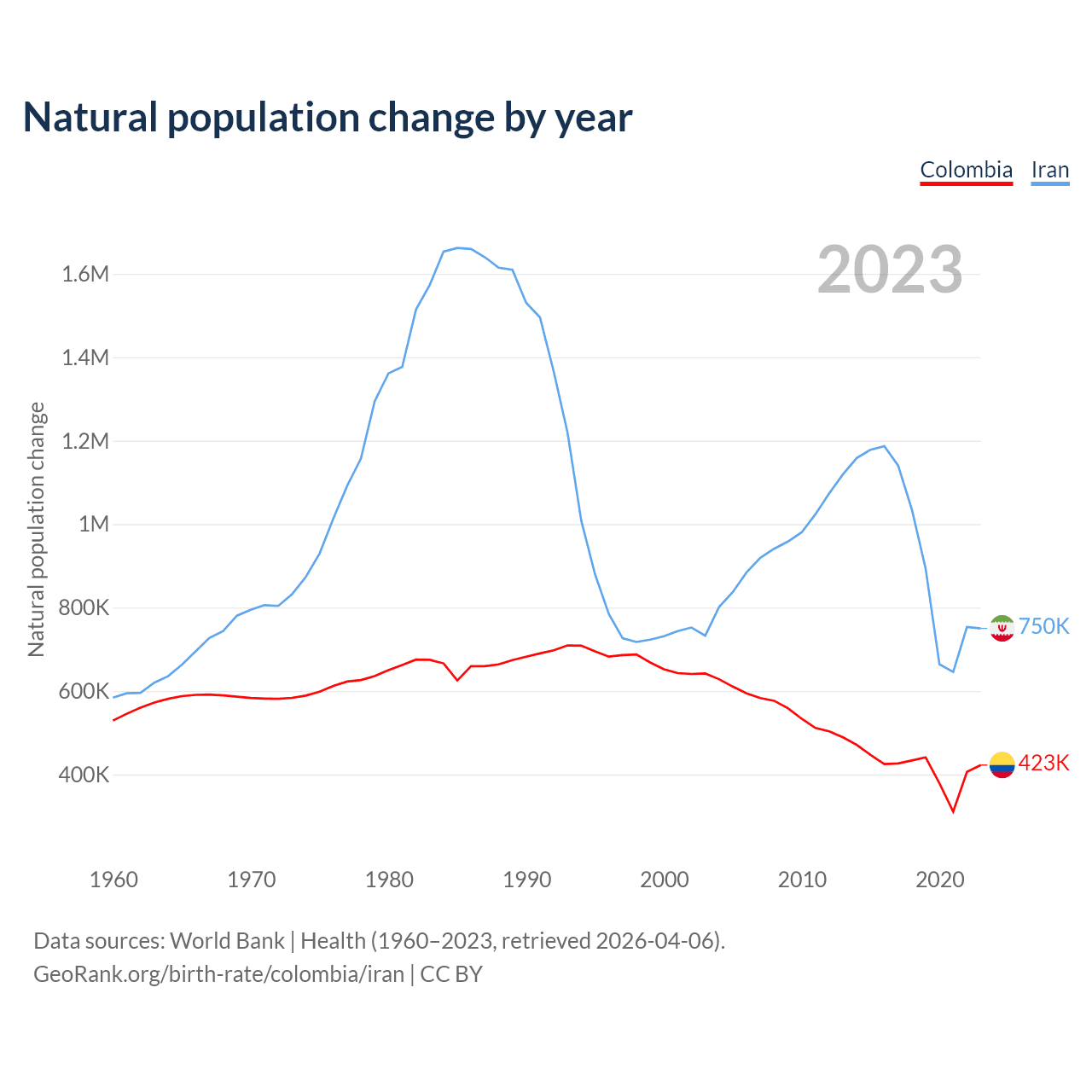 According to the latest available data on birth rates, the fertility rate in Colombia was 1.65 children per woman in 2023, compared to 1.7 in Iran in 2023. The replacement level is considered to be 2.1 children per woman.