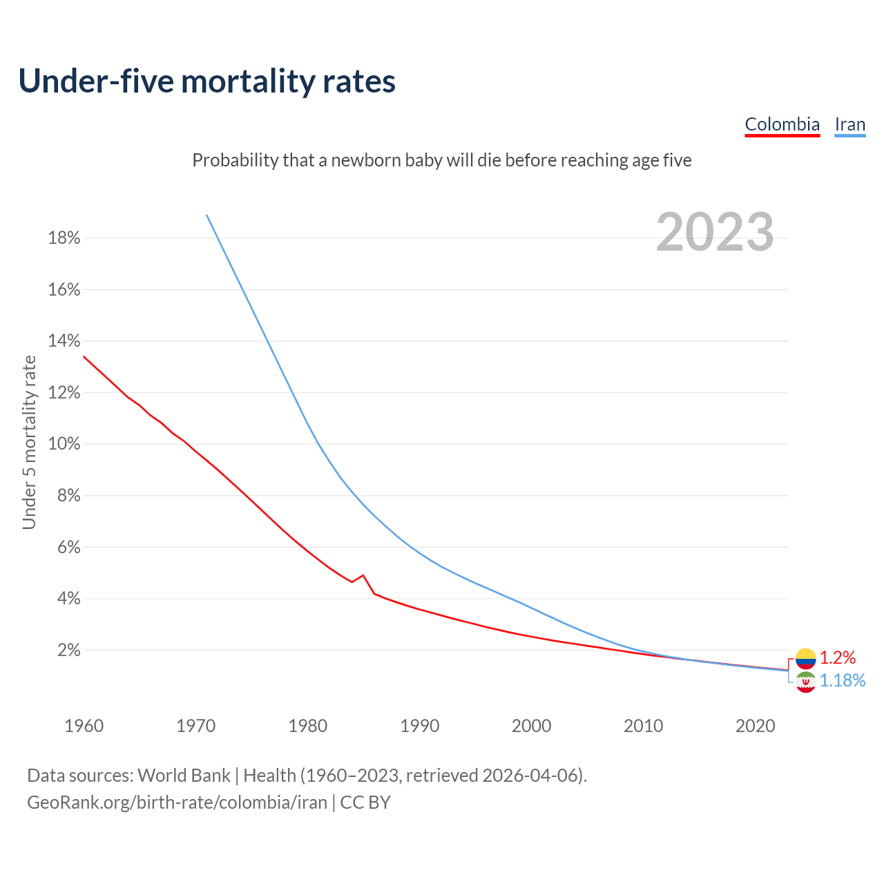 The chance that a newborn baby will die before reaching age five is 1.2% in Colombia and 1.18% in Iran. Above is a chart with historical data on under-five mortality rates.