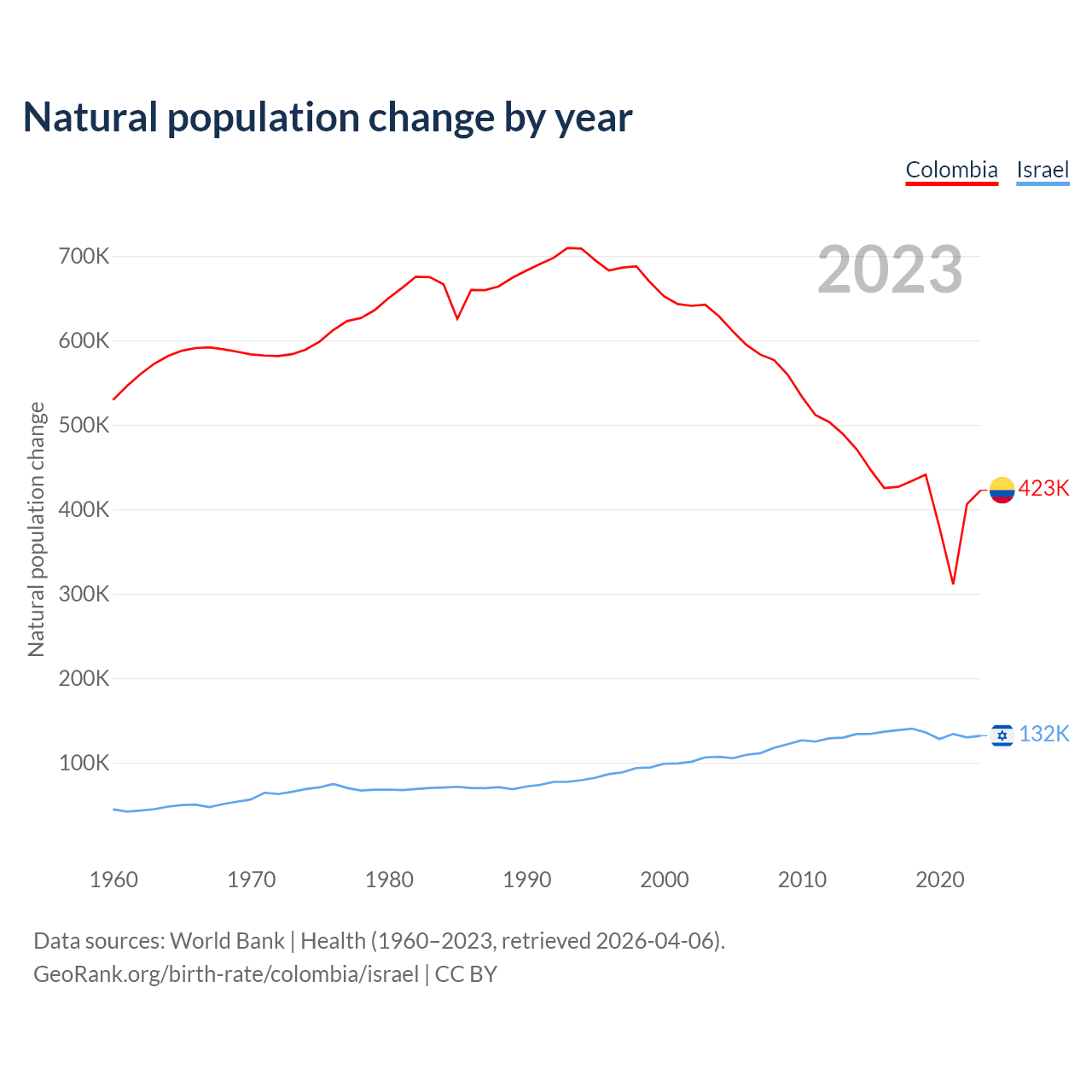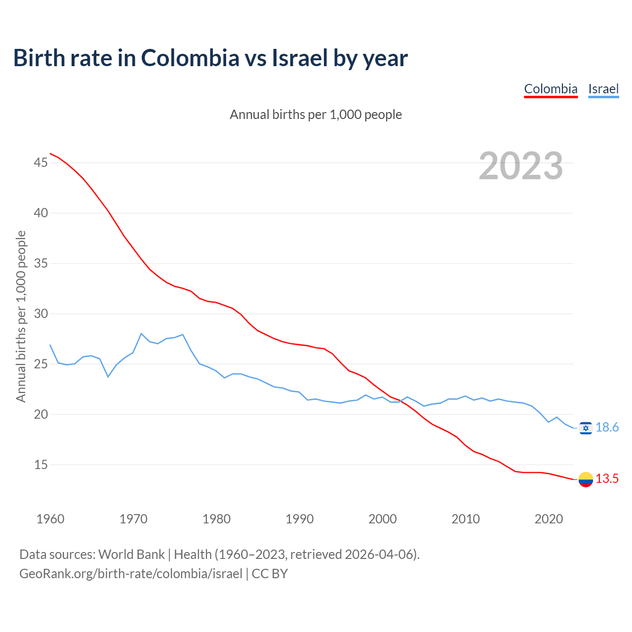 According to the latest available data on birth rates, the fertility rate in Colombia was 1.65 children per woman in 2023, compared to 2.85 in Israel in 2023. The replacement level is considered to be 2.1 children per woman.