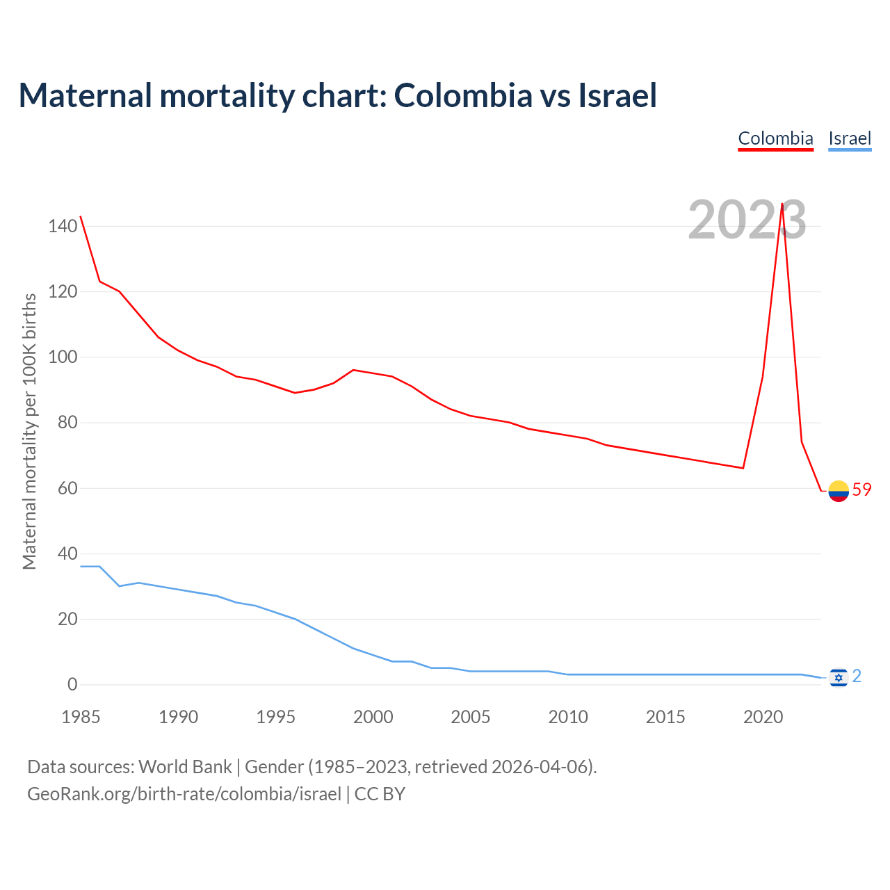 The maternal mortality rate, which is the probability of dying during childbirth or within 42 days of pregnancy termination, is 59 deaths per 100,000 live births in Colombia, compared to 2 deaths in Israel.