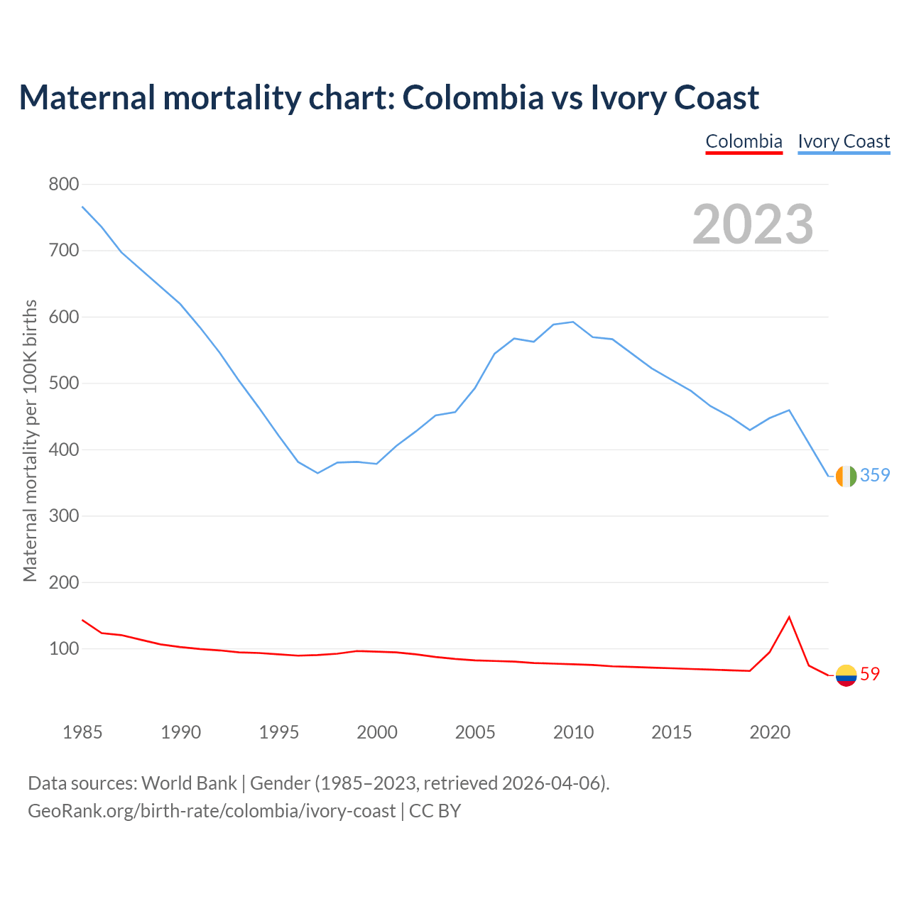 The maternal mortality rate, which is the probability of dying during childbirth or within 42 days of pregnancy termination, is 59 deaths per 100,000 live births in Colombia, compared to 359 deaths in Ivory Coast.