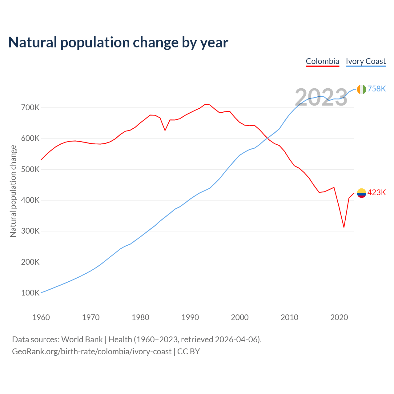 Colombia has an annual birth rate of 13.5 births per 1,000 people, compared to 32 for Ivory Coast. The average number of children a woman is expected to have during her lifetime — the fertility rate, is 1.65 in Colombia and 4.28 in Ivory Coast — 160.4% difference.