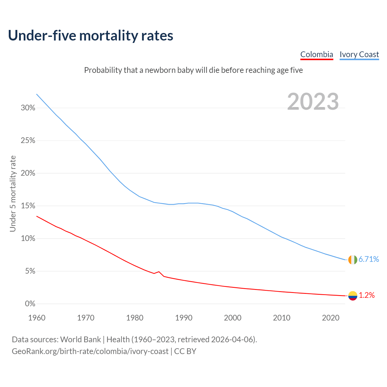 The chance that a newborn baby will die before reaching age five is 1.2% in Colombia and 6.71% in Ivory Coast. Above is a chart with historical data on under-five mortality rates.