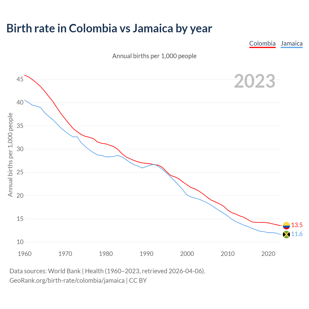 According to the latest available data on birth rates, the fertility rate in Colombia was 1.65 children per woman in 2023, compared to 1.36 in Jamaica in 2023. The replacement level is considered to be 2.1 children per woman.